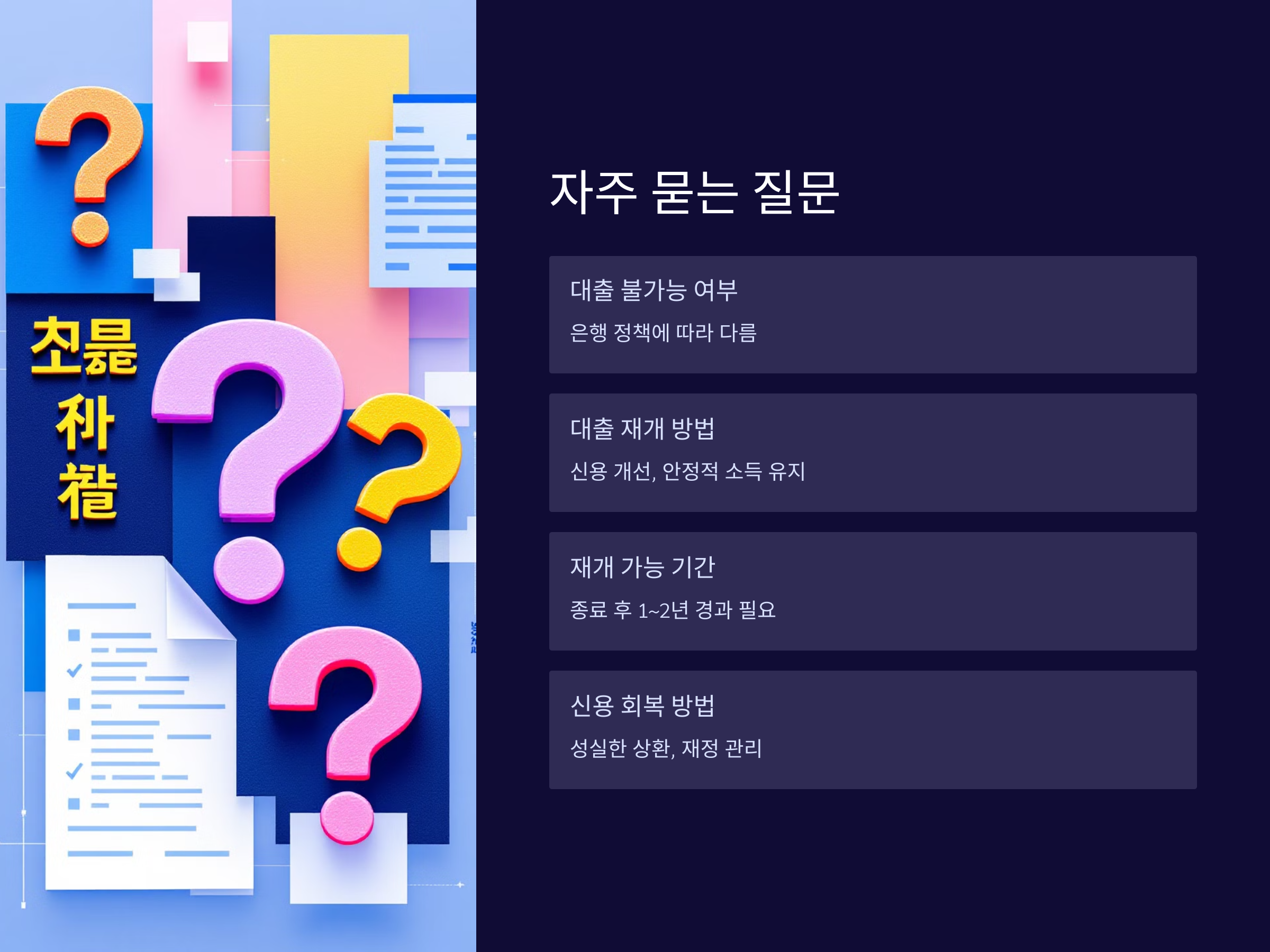워크아웃 신청 후 은행 대출을 재개할 수 있는지 여부는 여러 요소에 따라 달라지며, 신용 회복과 재정 상태 회복이 중요합니다. 워크아웃 종료 후 신용 점수를 회복하기 위한 시간과 노력이 필요하지만, 꾸준한 상환과 신용 회복 노력으로 대출을 재개할 수 있는 기회를 얻을 수 있습니다. 중요한 것은, 대출을 재개하려는 계획을 세울 때 충분한 시간을 두고 신중하게 준비하는 것입니다.