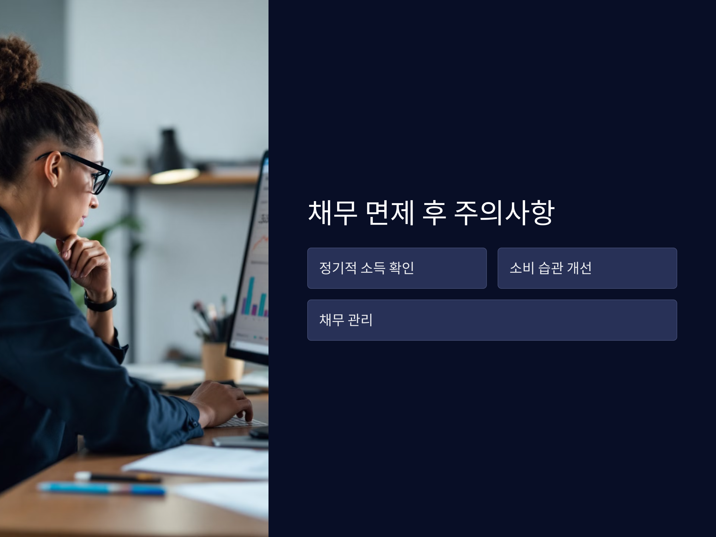 채무 면제를 받은 후에도 주의할 점이 많습니다. 채무 면제 후에는 재정적으로 새로운 출발을 할 수 있지만, 면제된 채무가 다시 발생하지 않도록 노력해야 합니다. 또한, 채무 면제 후에는 신용도에 큰 영향을 미치기 때문에, 신용회복을 위한 적극적인 노력이 필요합니다.