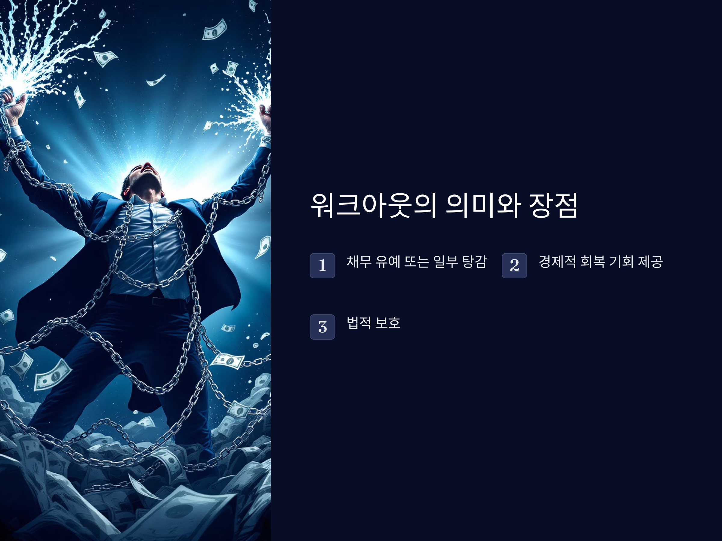 워크아웃의 주요 장점은 채무자에게 경제적 회복의 기회를 제공한다는 것입니다. 상환 불가능한 부채에 대한 처리를 통해 새로운 시작을 할 수 있습니다. 또한, 워크아웃이 채무 면제를 위한 첫 단계가 될 수 있기에 장기적인 경제적 회복을 위해 중요한 단계로 볼 수 있습니다. 워크아웃을 신청하면 법적인 보호를 받을 수 있기 때문에, 채권자가 즉시 강제 집행을 할 수 없습니다.
