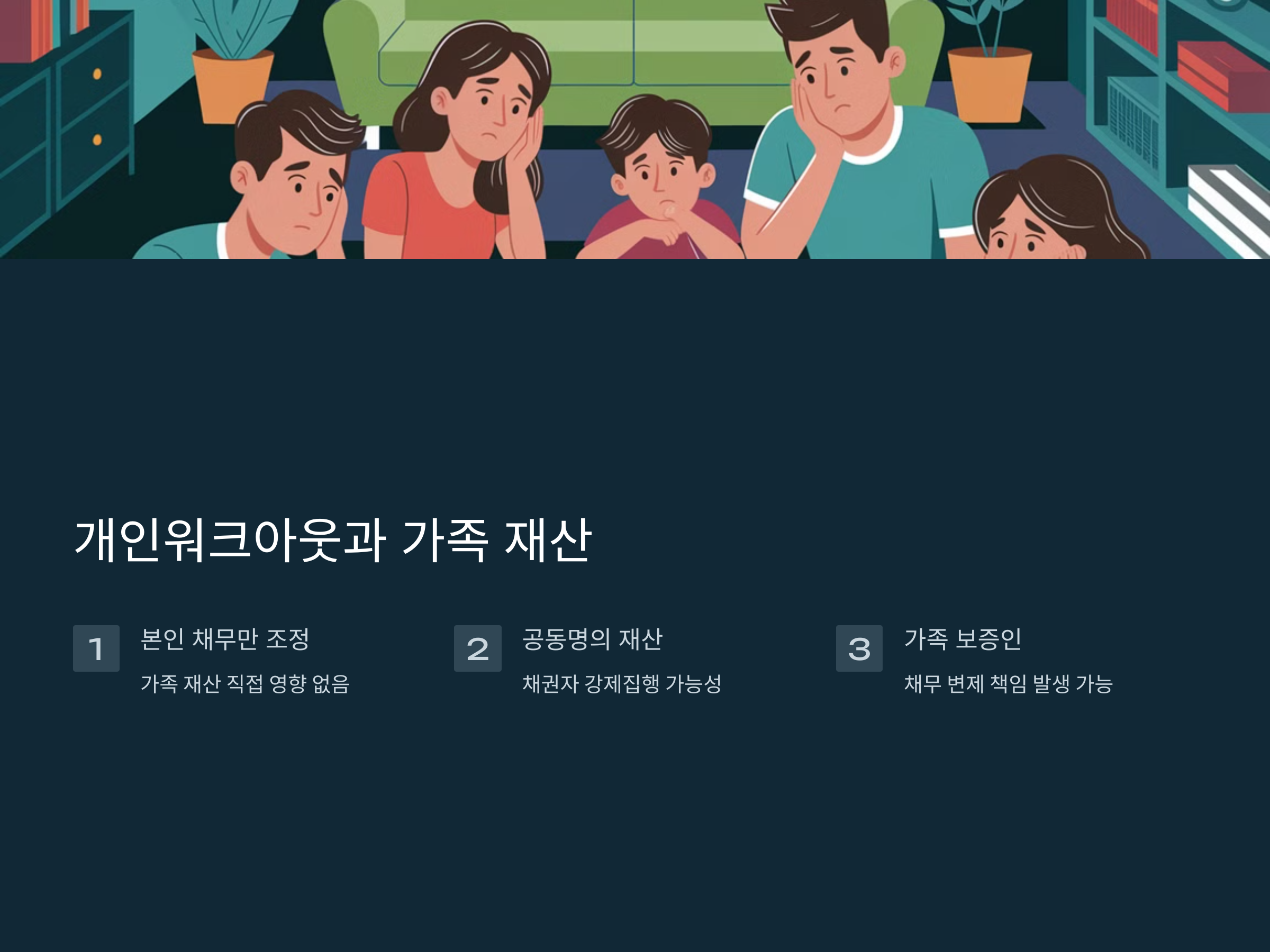 개인워크아웃은 신청자의 채무를 조정하는 절차이므로, 원칙적으로 배우자나 부모, 자녀의 재산에는 영향을 미치지 않습니다. 하지만 다음과 같은 경우에는 예외적으로 가족 재산도 영향을 받을 수 있습니다.
