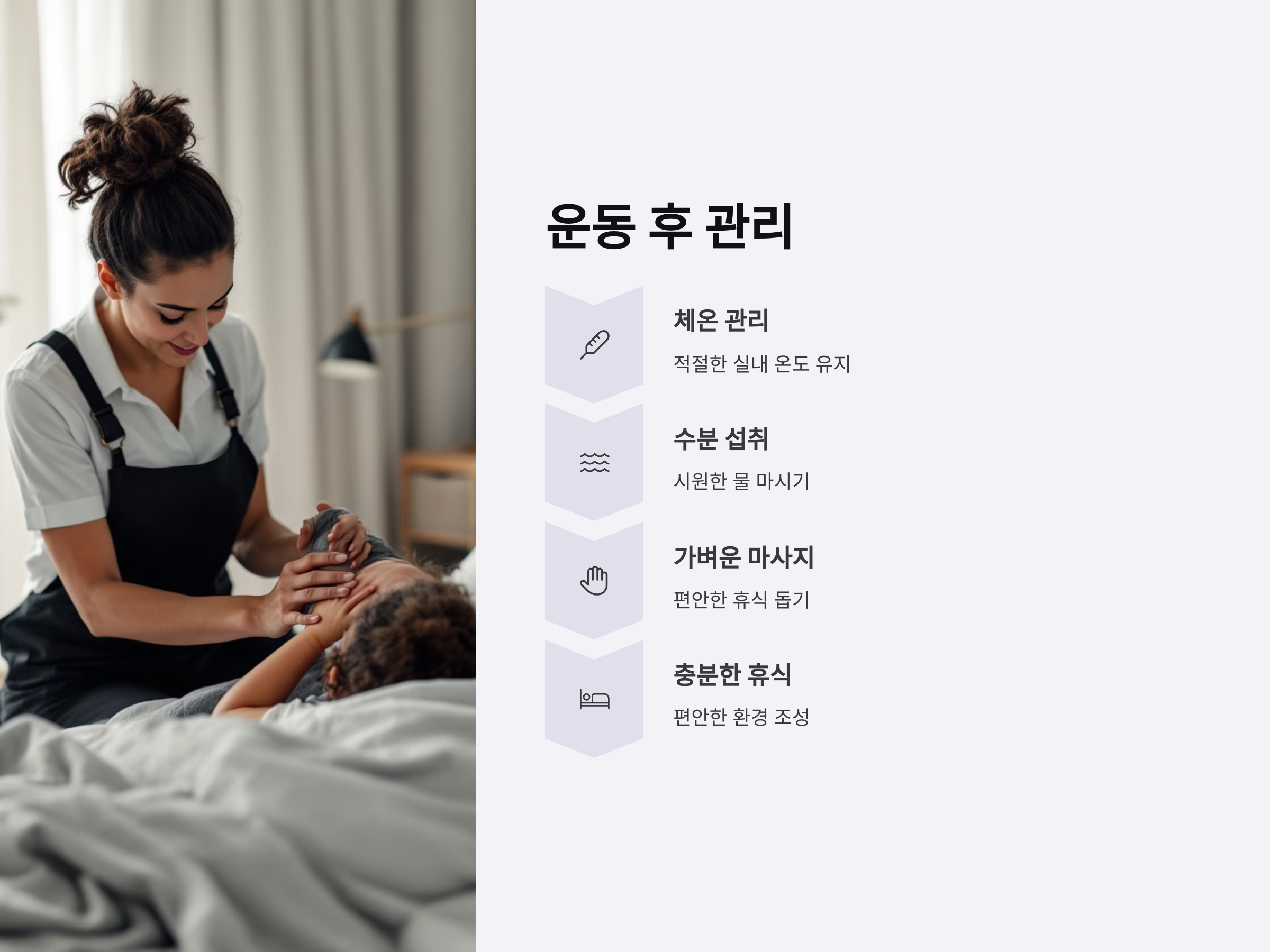 운동 후에는 근육 회복을 위한 관리가 필수입니다. 회복을 제대로 하지 않으면 근육의 피로가 누적되고, 이는 장기적인 부상의 원인이 될 수 있습니다. 따라서 운동 후 관리가 잘 되어야 합니다.