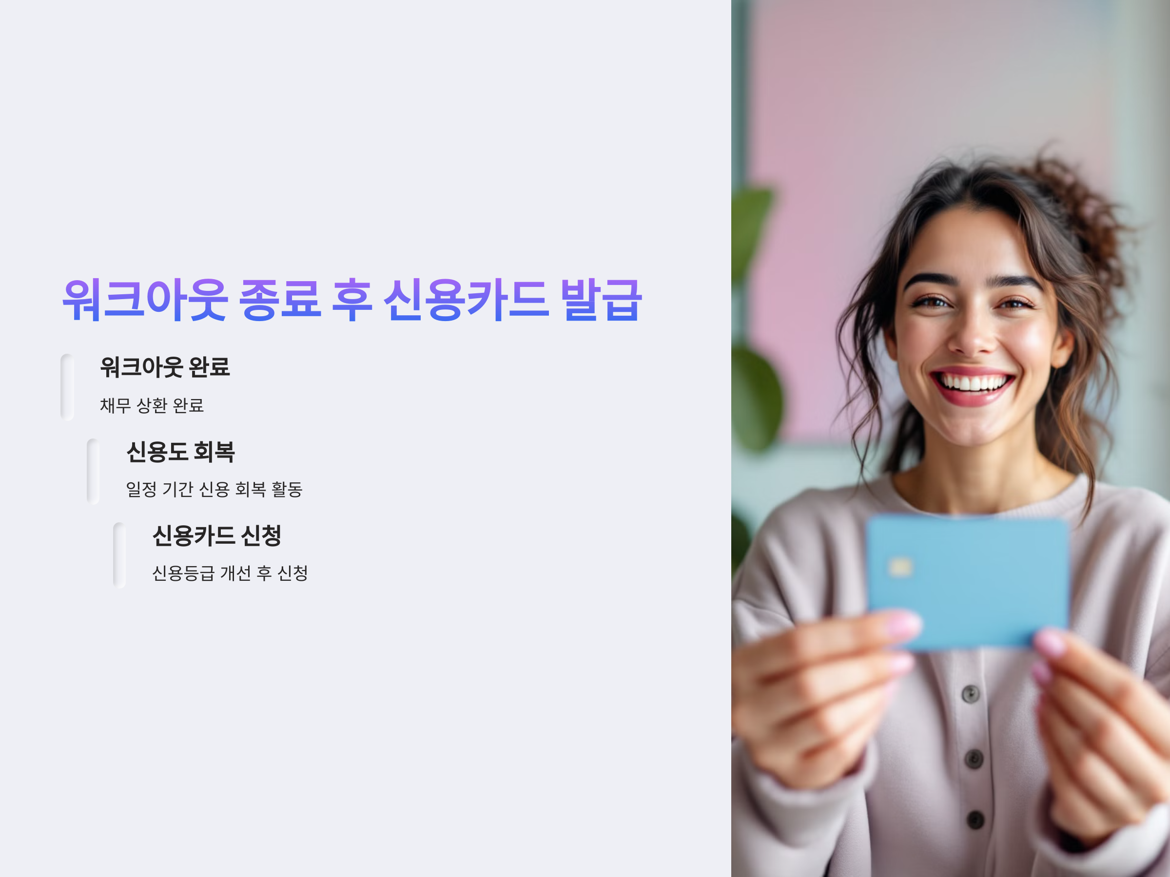 워크아웃이 종료된 후에는 신용카드 발급이 비교적 수월해질 수 있습니다. 워크아웃 종료 후 일정 기간 동안 신용도를 회복하고, 채무 상환을 마친 상태라면, 신용카드 발급이 가능할 수 있습니다. 다만, 이 경우에도 신용등급이 여전히 중요한 기준이 됩니다.