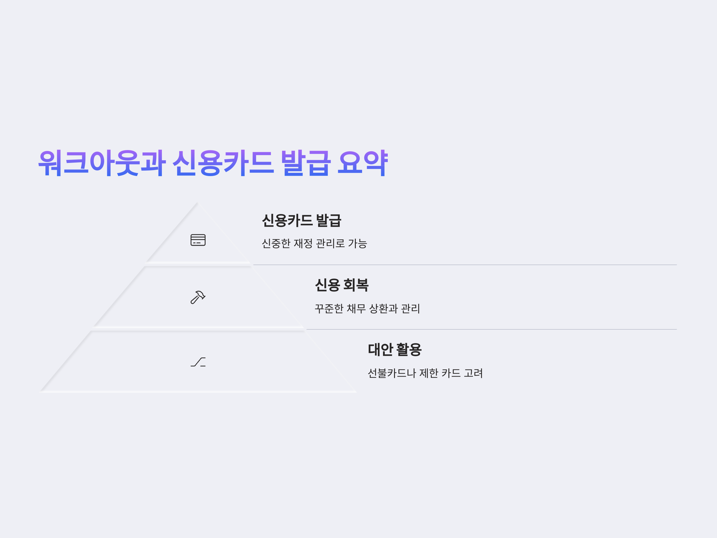 워크아웃을 진행 중인 상태에서 신용카드를 발급받는 것은 신중하게 고려해야 합니다. 신용카드를 발급받기 전, 그 사용이 본인에게 재정적인 부담이 되지 않는지 철저히 점검해야 합니다. 또한, 신용카드를 잘못 사용할 경우 채무가 다시 늘어날 수 있기 때문에, 신중한 재정 관리가 중요합니다.