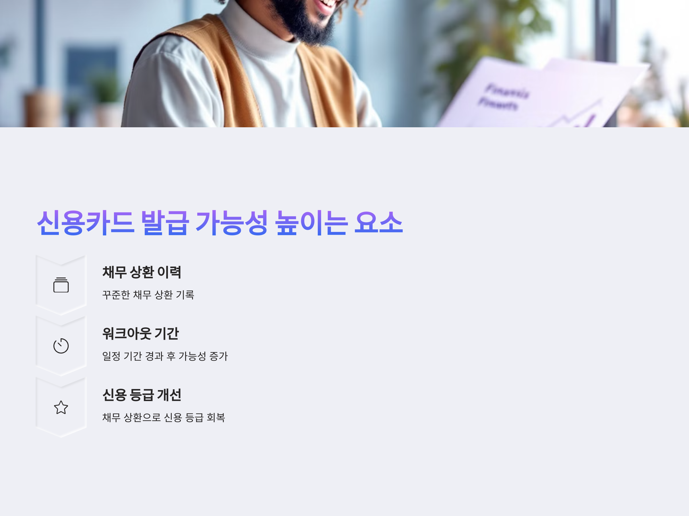 - 신용 등급: 신용카드 발급은 개인의 신용 등급에 크게 의존합니다. 워크아웃을 진행 중이라면 신용 등급이 낮을 수 있으나, 워크아웃이 마무리되거나 채무 상환을 충실히 하면 점차 신용 등급이 개선될 수 있습니다. 이 경우, 신용카드 발급이 가능할 수 있습니다.