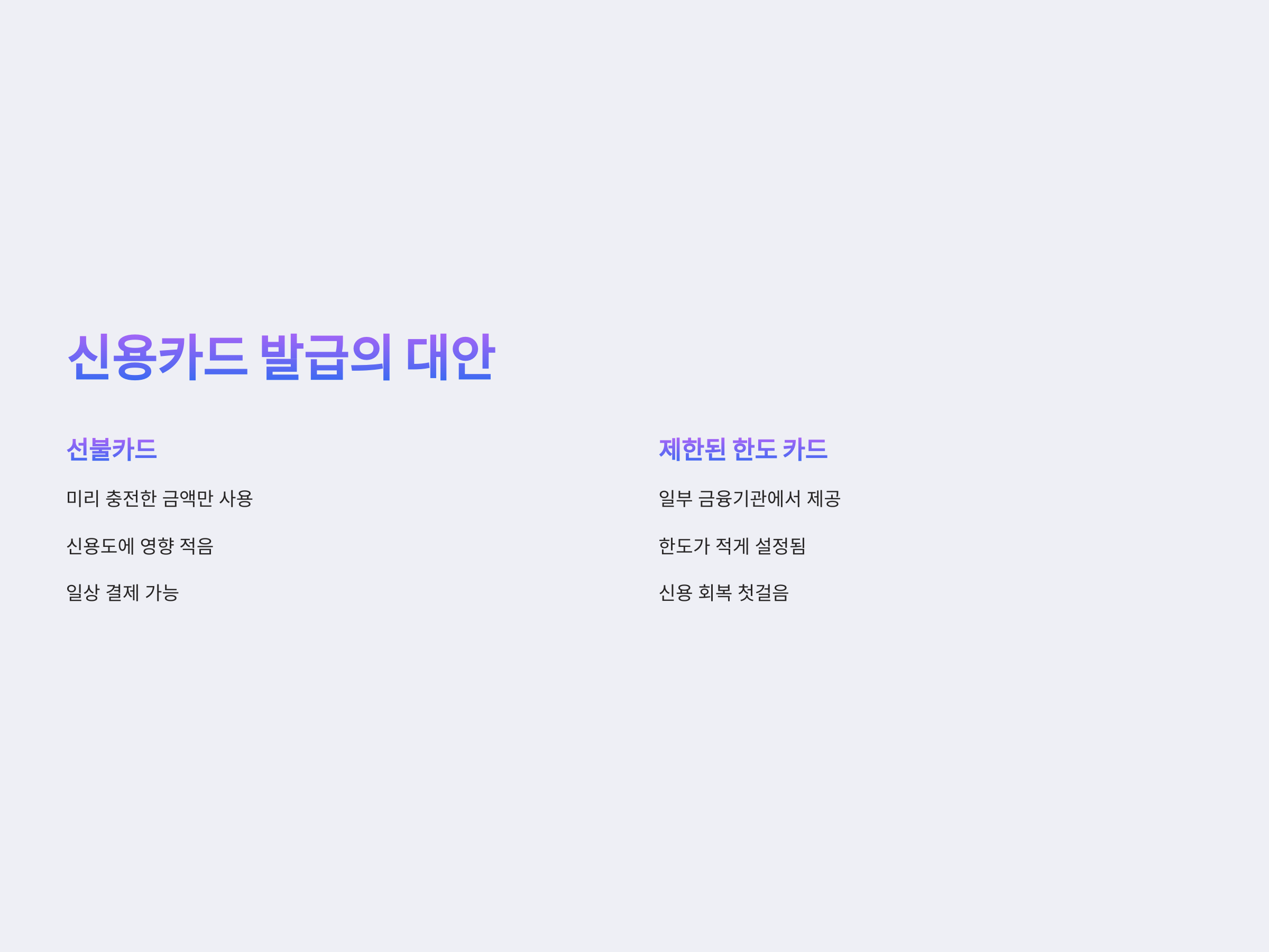 선불카드는 미리 충전한 금액만큼 사용할 수 있는 카드로, 신용카드와 유사한 기능을 합니다. 선불카드는 신용도가 낮거나 워크아웃을 진행 중인 사람들에게 적합한 대안이 될 수 있습니다. 신용카드 발급이 어려운 경우, 선불카드를 사용하면 카드 결제를 통해 신용을 관리하면서 점차 신용을 회복할 수 있습니다.