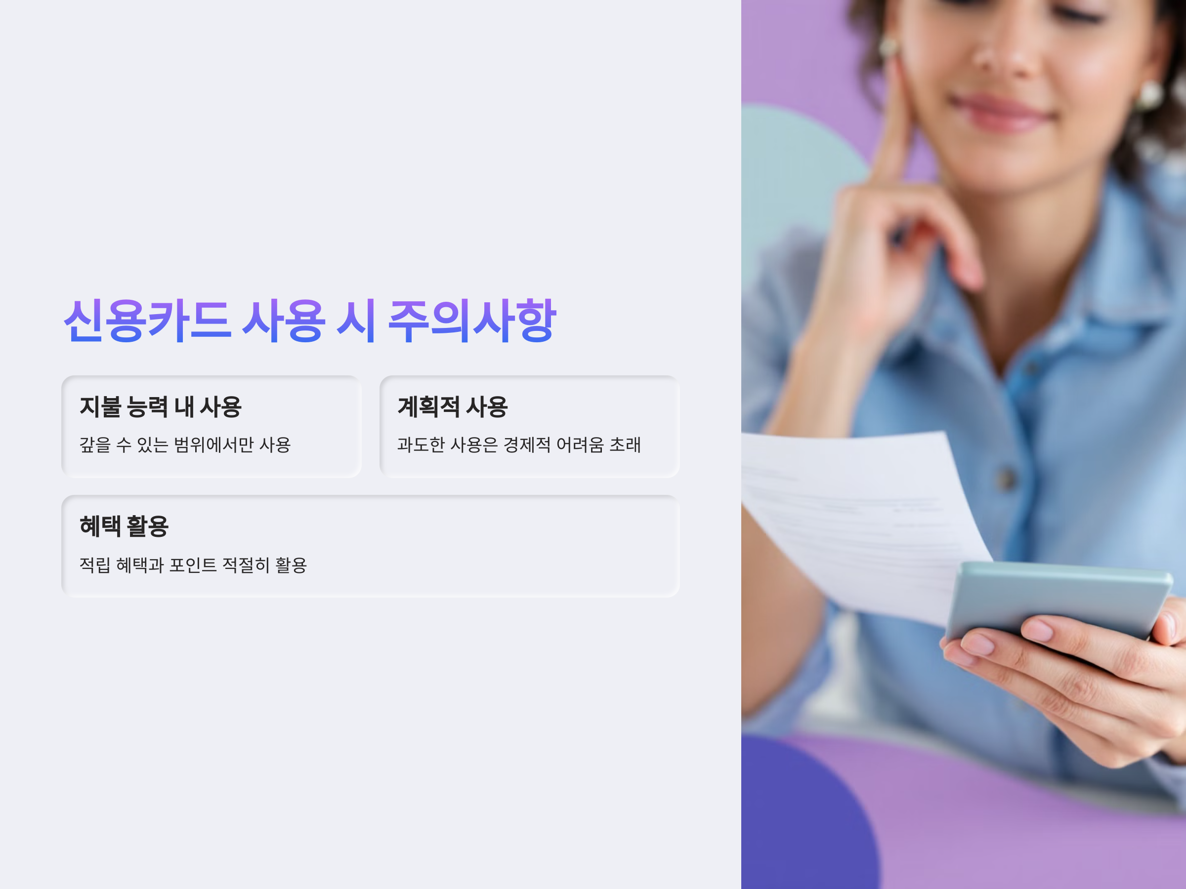 신용카드를 사용하려면 반드시 자신이 갚을 수 있는 범위 내에서 사용해야 합니다. 신용카드는 편리하지만, 과도한 사용은 다시 경제적인 어려움을 초래할 수 있기 때문에 계획적으로 사용해야 합니다. 또한, 신용카드를 통해 얻을 수 있는 적립 혜택이나 포인트 등도 적절하게 활용하면, 경제적인 이득을 볼 수 있습니다.