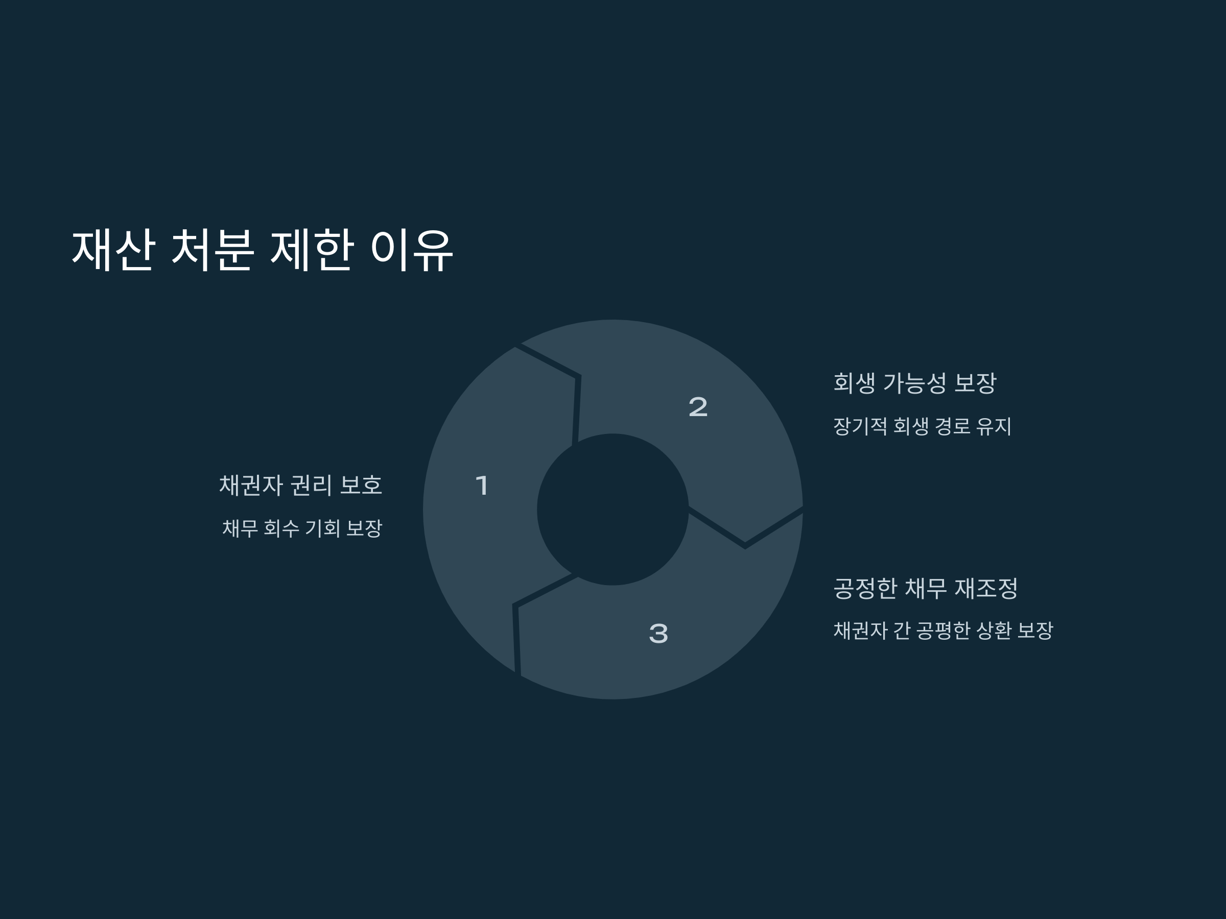 - 회생 가능성 보장: 자산을 처분하여 단기적인 재정적 이득을 취하는 대신, 장기적으로 회생할 수 있는 경로를 유지하려는 목적입니다.