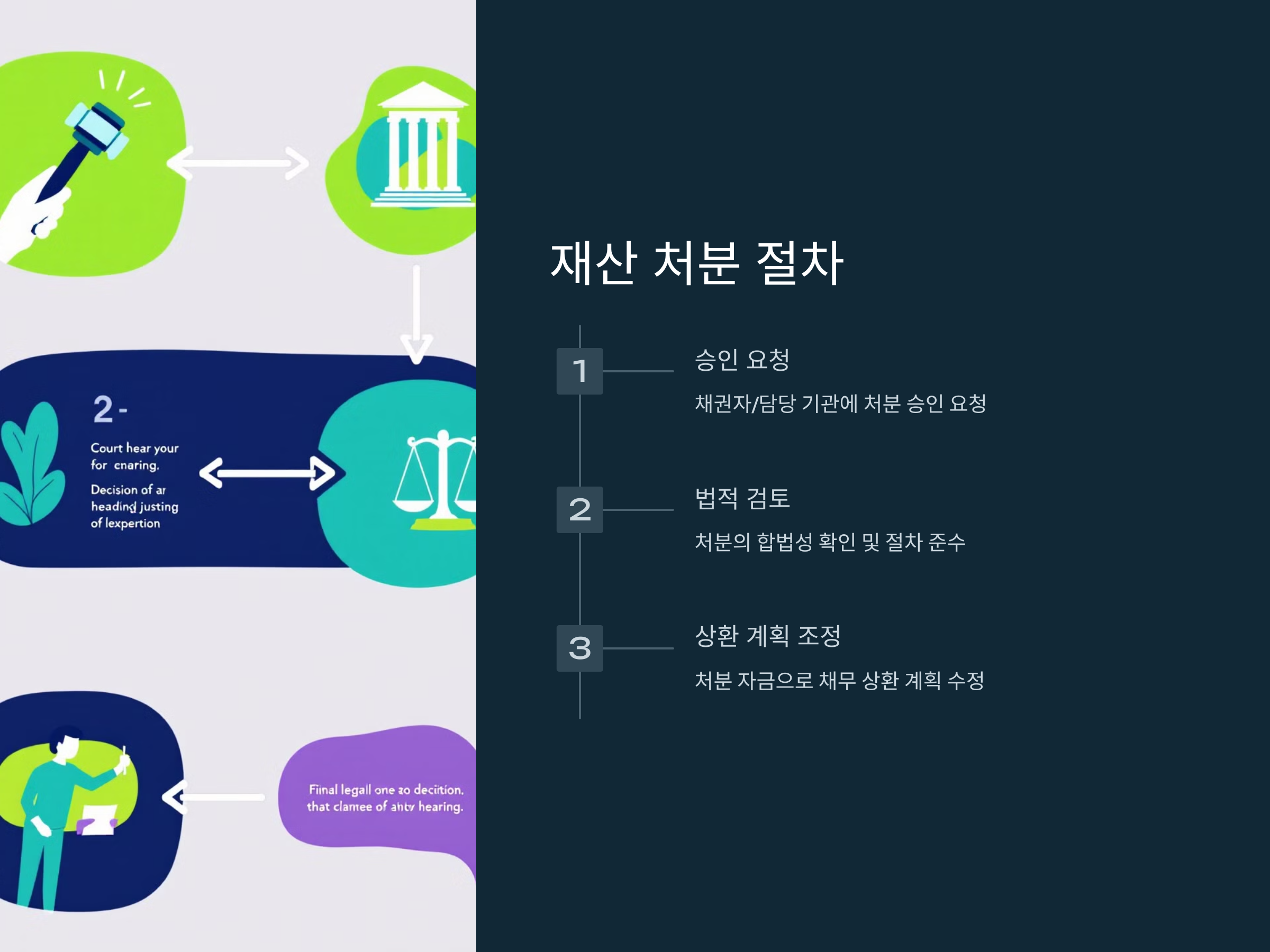 - 상환 계획 조정: 자산 처분으로 얻은 자금을 채무 상환에 사용할 경우, 상환 계획이 조정될 수 있습니다. 이때, 채권자들과의 협상이 필요할 수 있습니다.
