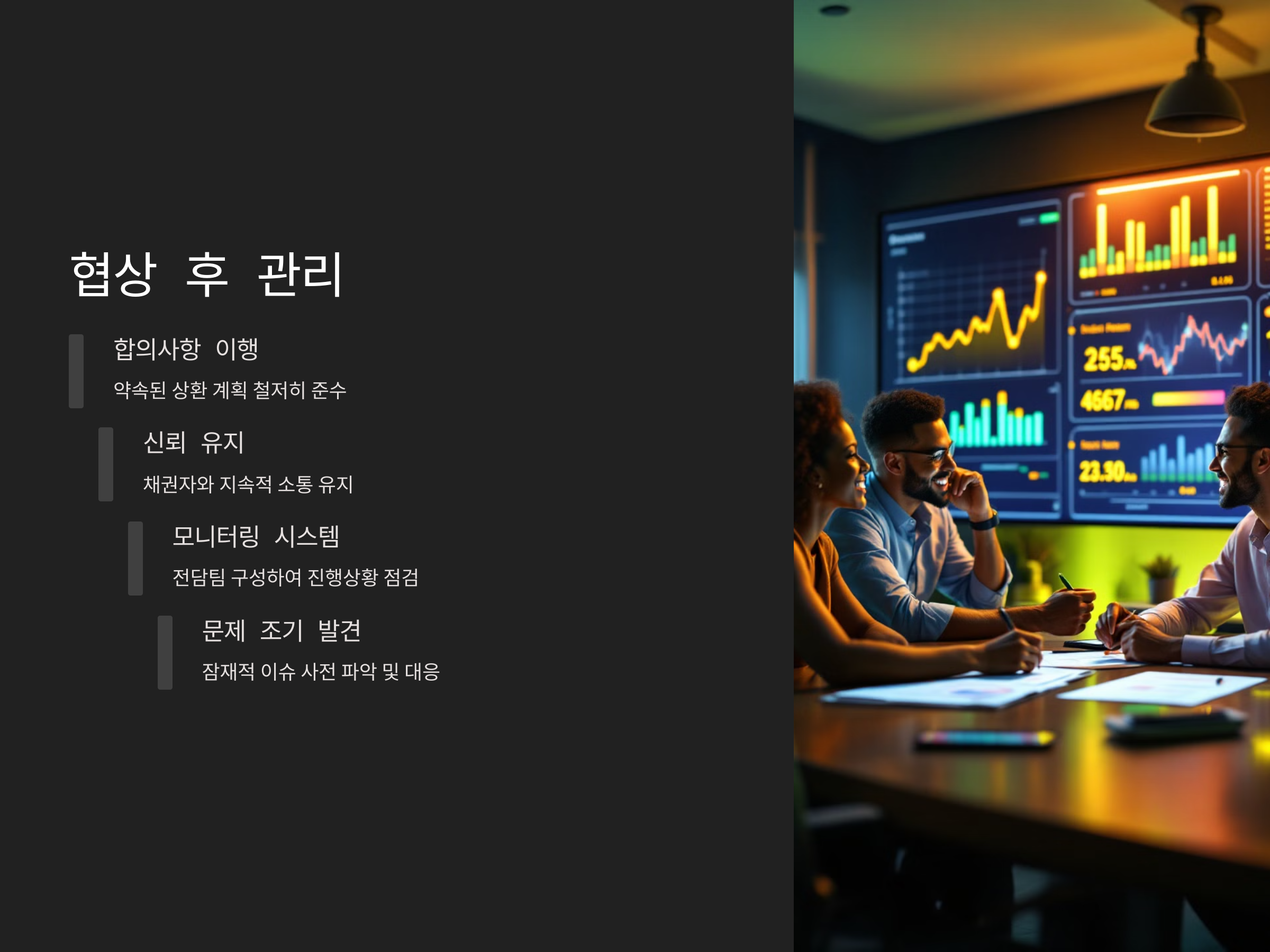 채권자와의 협상이 마무리된 후에는 후속 관리가 중요합니다. 협상 후, 합의 사항을 철저히 이행하고, 채권자와의 신뢰를 유지하는 것이 중요합니다. 협상 후의 관계 관리가 잘 이루어져야만, 이후 발생할 수 있는 다른 재정적 어려움에도 유연하게 대응할 수 있습니다.