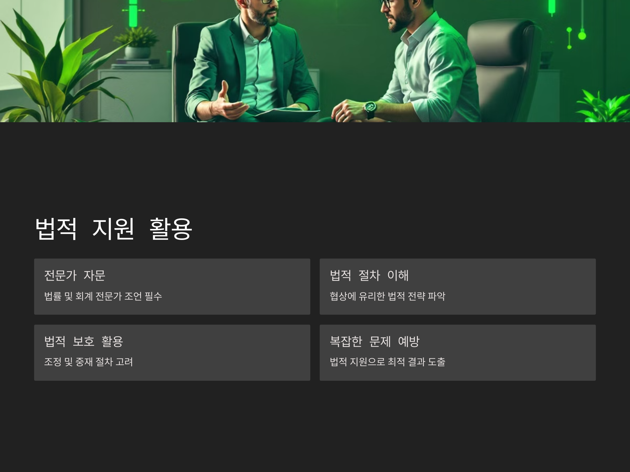 워크아웃을 진행하면서 법적 지원을 받는 것도 중요한 부분입니다. 법률 전문가나 회계 전문가의 조언을 받으면, 협상에서 유리한 조건을 이끌어내기 위한 법적인 절차와 전략을 명확히 이해할 수 있습니다. 또한, 법적 지원을 통해 협상에서 발생할 수 있는 복잡한 법적 문제들을 예방하고, 기업이 최적의 결과를 도출할 수 있도록 도와줍니다.