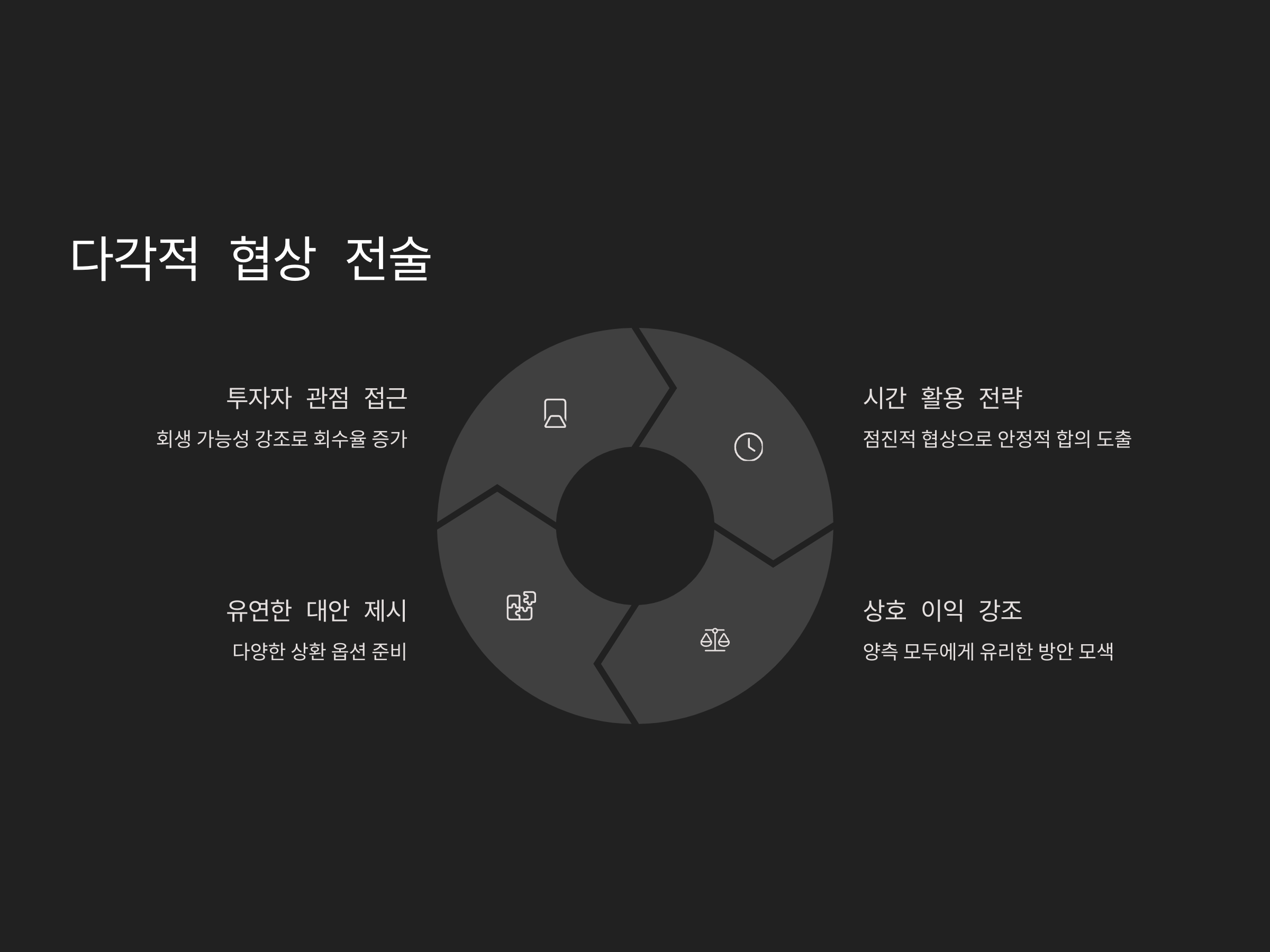 협상 과정에서는 다양한 전술을 활용하는 것이 중요합니다. 첫째, "투자자의 입장에서 생각하기" 전략을 적용할 수 있습니다. 채권자들은 기업이 회생 가능성을 높이면 더 많은 돈을 회수할 수 있다는 점을 잘 알고 있기 때문에, 기업의 회복 가능성을 강조하며 협상하는 것이 유리할 수 있습니다.