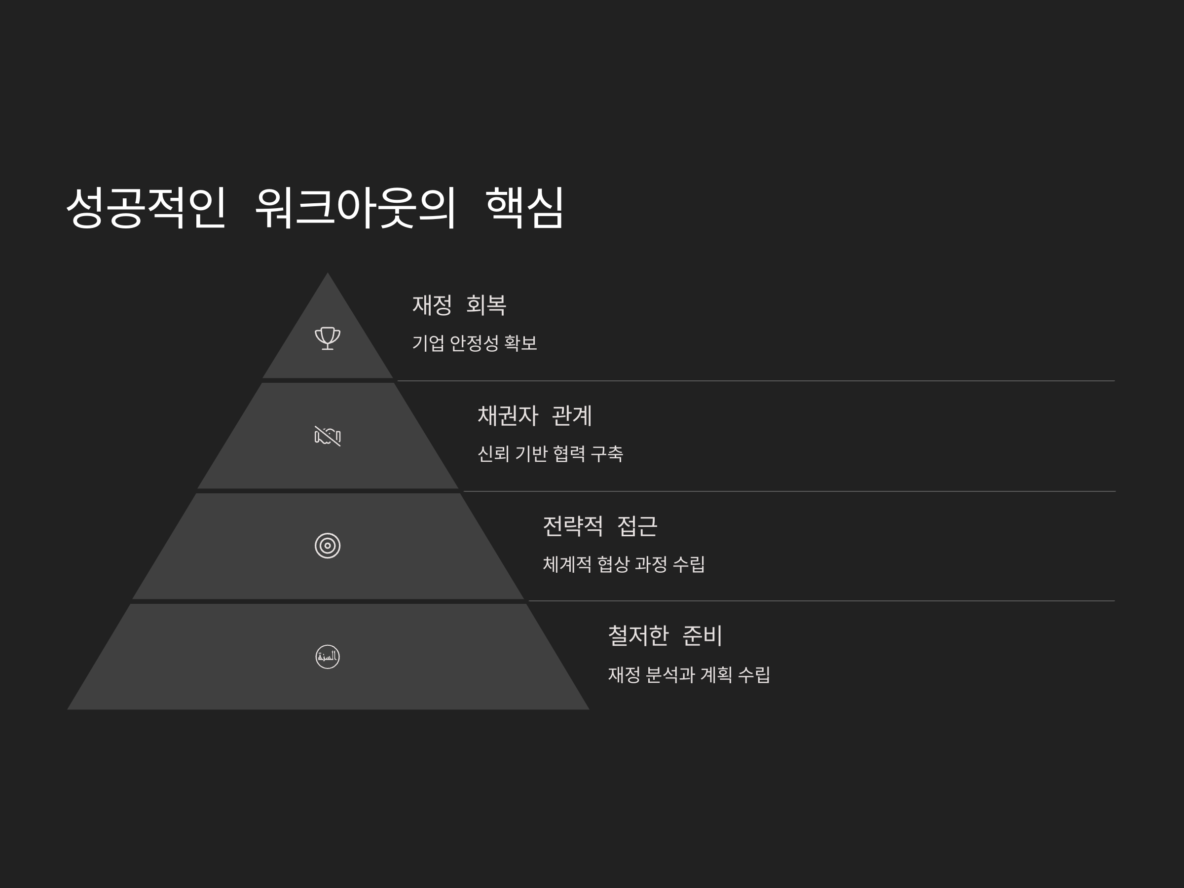 워크아웃 과정에서 중요한 점은 채권자에게 유리한 조건을 제시하는 것입니다. 기업이 회생할 수 있는 길을 제시하며, 이를 통해 채권자들이 회수할 수 있는 금액이 더 많을 수 있음을 강조하는 것이 핵심입니다. 예를 들어, 장기적인 상환 기간을 제시하거나 이자율을 인하하는 등의 조건을 협상할 수 있습니다.