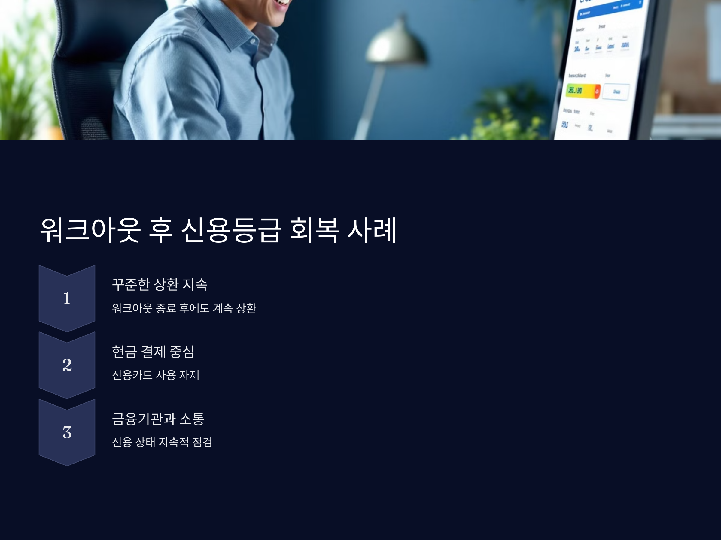 실제 워크아웃을 진행한 사람들의 사례를 보면, 신용등급을 회복하는 데 성공한 사람들은 대부분 세 가지 중요한 전략을 따랐습니다. 첫째, 워크아웃이 끝난 후에도 꾸준한 상환을 지속했으며, 둘째, 신용카드 사용을 자제하고 현금 결제 중심으로 생활을 개선했습니다. 셋째, 금융기관과의 소통을 통해 신용 상태를 지속적으로 점검하며, 필요한 경우 추가적인 지원을 요청했습니다.