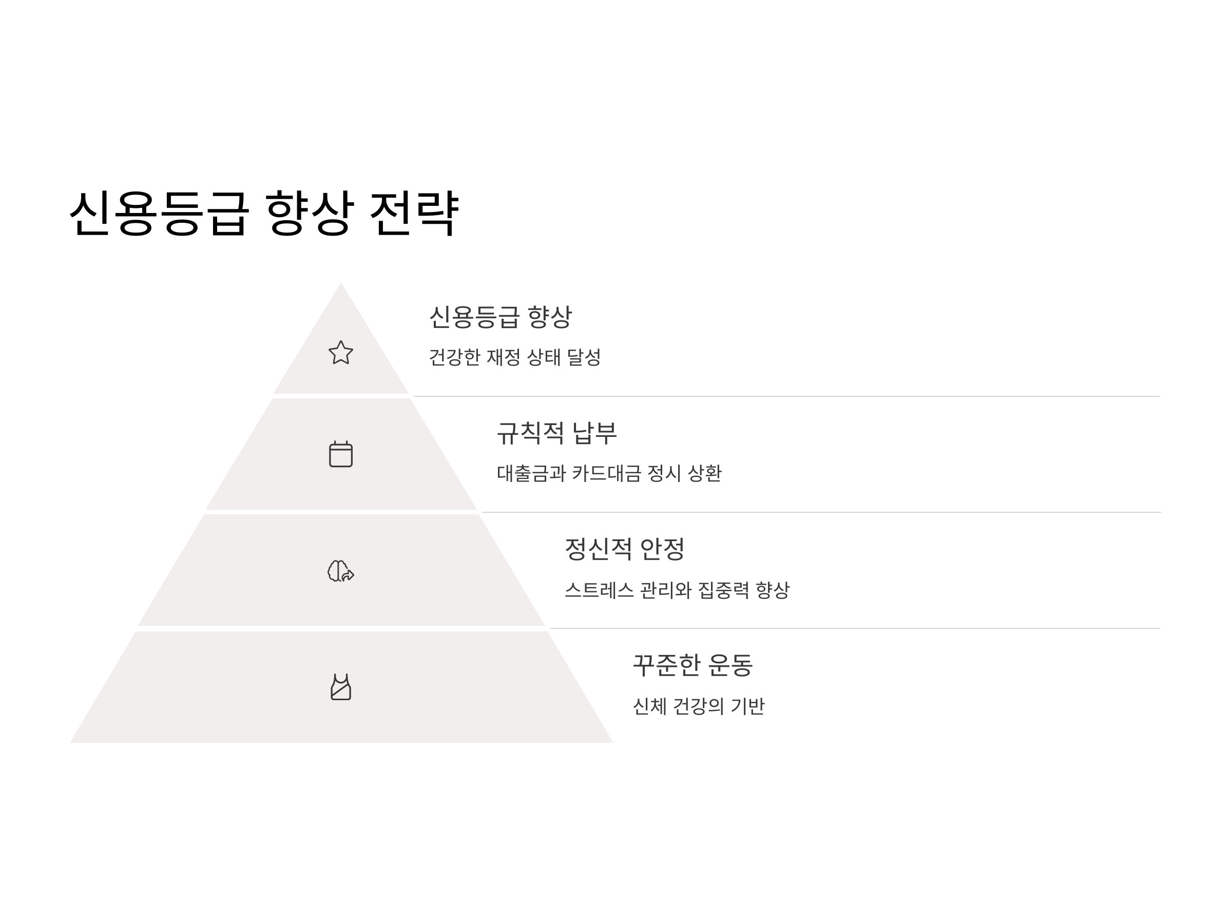 신용등급은 금융기관에서 개인의 신용을 평가하는 중요한 기준으로, 여러 요소들을 종합적으로 반영하여 산정됩니다. 신용등급을 결정하는 주요 요소는 신용카드 사용 내역, 대출 상환 기록, 채무 상태 등입니다. 이들 요소가 잘 관리되지 않으면 신용등급은 낮아질 수 있고, 반대로 올바른 재정 관리가 이루어지면 신용등급이 향상됩니다. 워크아웃, 즉 운동을 시작하게 되면 신체 건강뿐만 아니라 정신적 안정감도 함께 얻어지기 때문에 재정 관리를 보다 철저히 하게 될 가능성도 큽니다.
