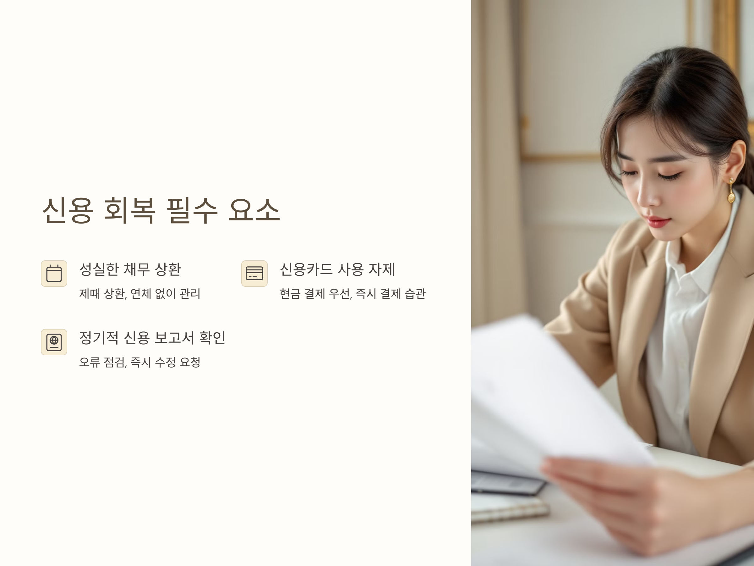 - 신용카드 사용 자제: 신용카드를 사용하지 않는 것이 신용 회복에 유리합니다. 불필요한 카드 사용을 피하고, 현금으로 결제하는 것이 좋습니다. 만약 신용카드를 사용할 경우, 즉시 결제하는 습관을 들이는 것이 좋습니다.