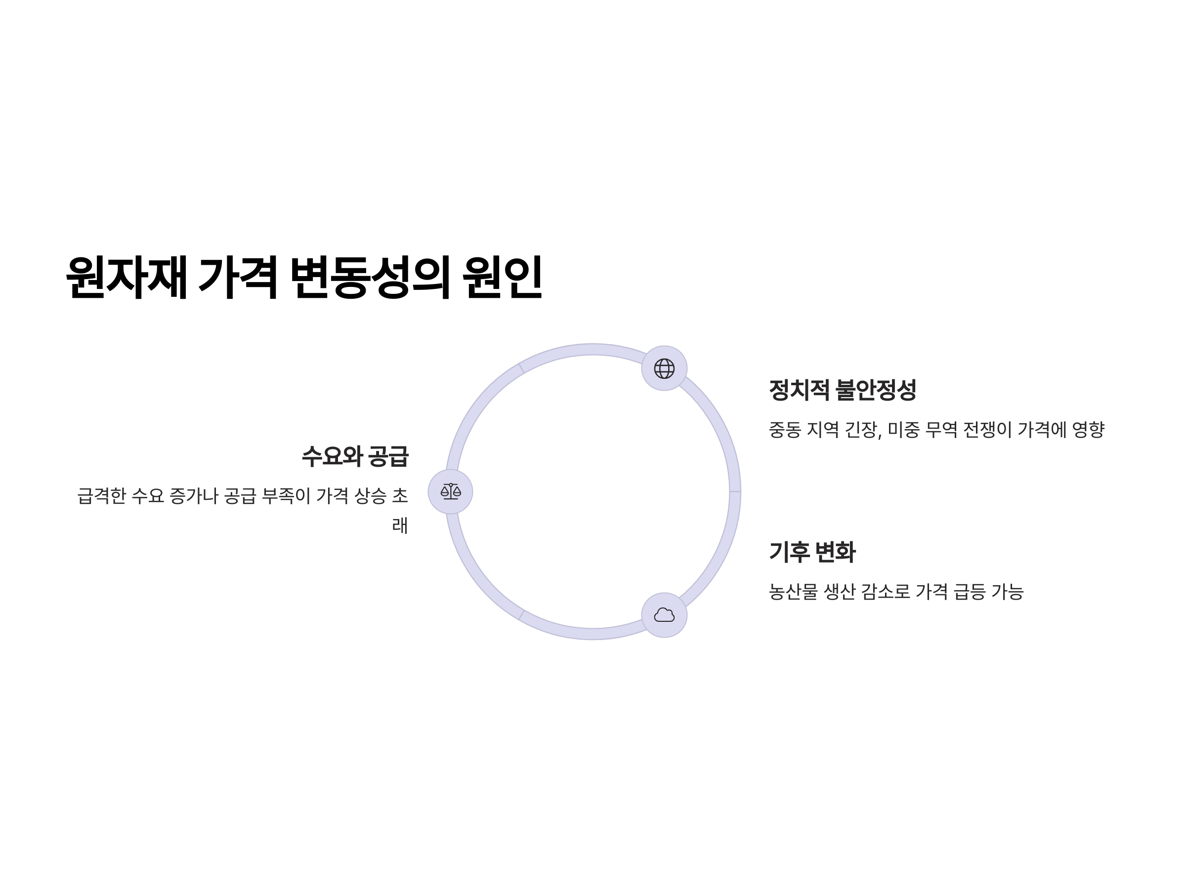 원자재 가격의 변동성은 기업 운영에 직간접적인 영향을 미칩니다. 원자재는 대부분의 산업에서 핵심적인 생산 요소이기 때문에, 원자재 가격이 급등하면 기업의 생산 비용이 증가하게 됩니다. 예를 들어, 석유 가격이 상승하면 운송 비용과 생산 비용이 함께 증가하게 되어, 이는 기업의 이익률에 큰 영향을 미칠 수 있습니다.