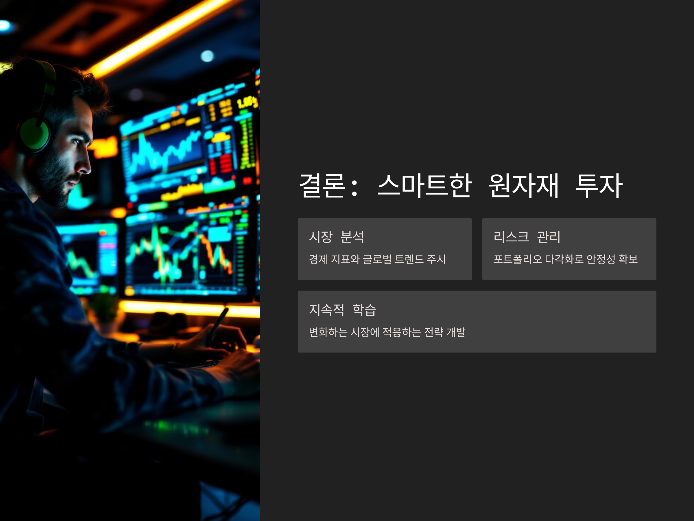 원자재 투자에서 중요한 점은 리스크 관리입니다. 원자재 시장은 변동성이 크기 때문에, 투자자는 항상 리스크를 분산시키는 전략을 취해야 합니다.