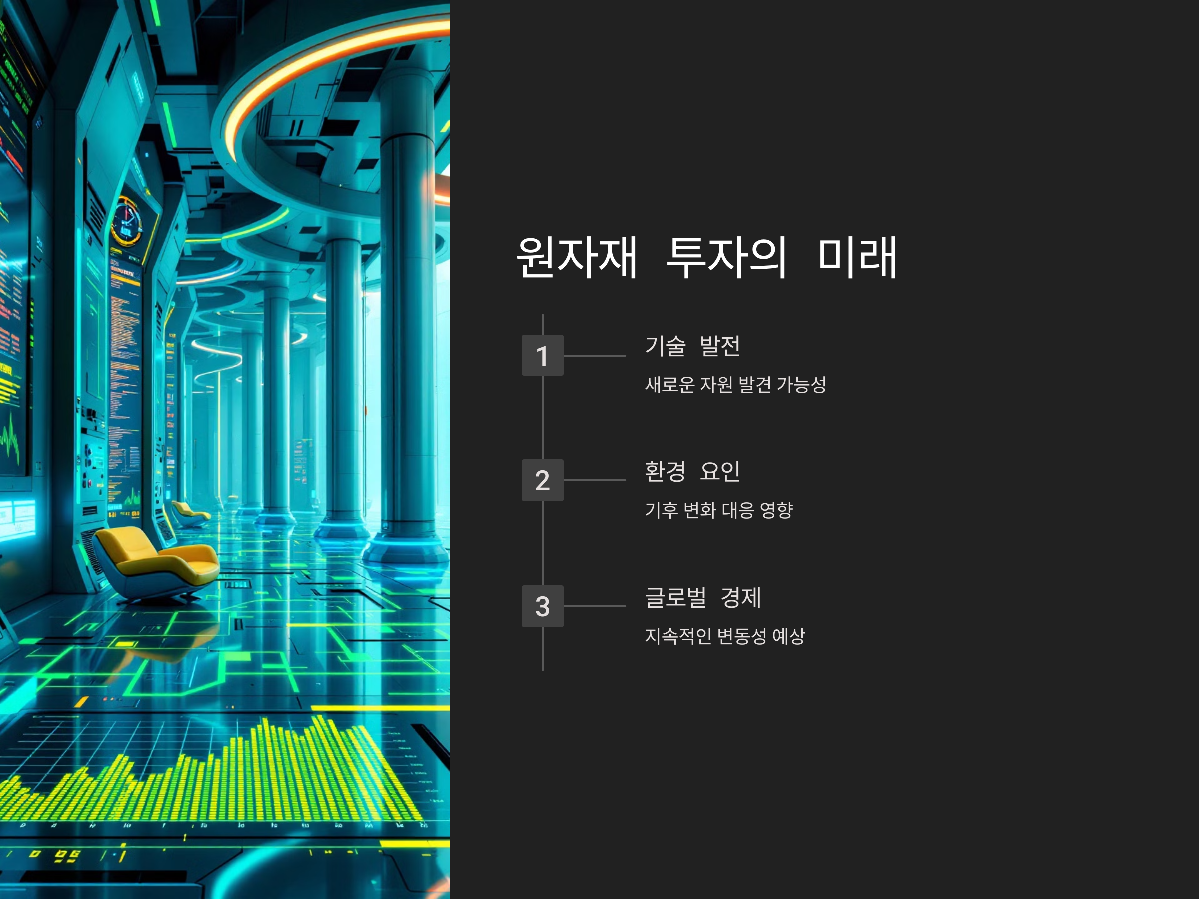 원자재 시장은 계속해서 변화하고 있으며, 특히 글로벌 경제와 환경적 요인에 따라 앞으로도 큰 변동성을 보일 가능성이 큽니다. 기술 발전과 새로운 자원 발견, 기후 변화 대응 등 다양한 요소들이 원자재 시장에 영향을 미칠 것입니다. 이에 따라 원자재 투자 전략도 지속적으로 진화하고 있으며, 투자자들은 이를 잘 반영하여 더욱 스마트한 투자 결정을 내릴 수 있어야 합니다