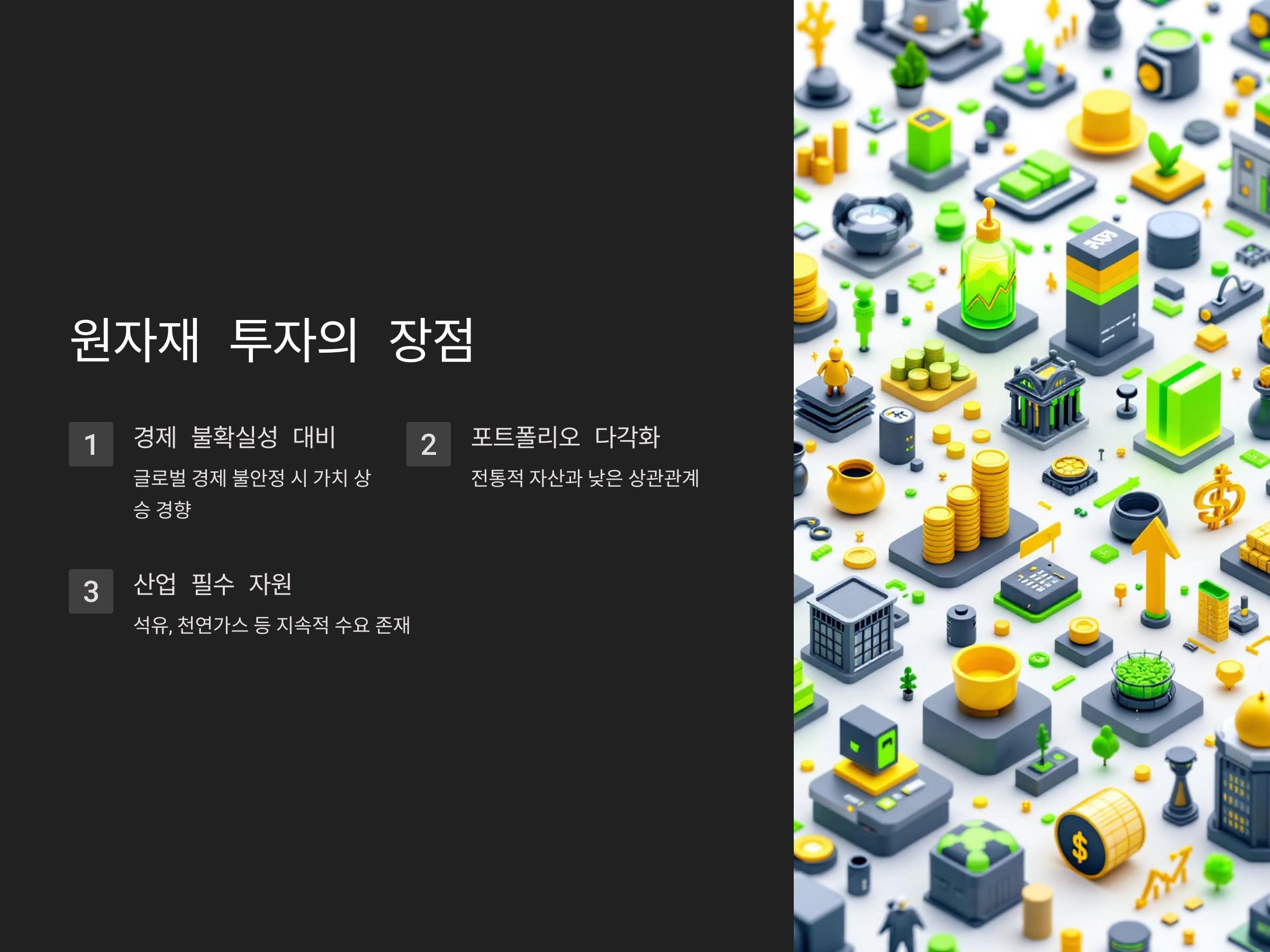 원자재에 투자하는 가장 큰 장점은 글로벌 경제가 불확실할 때 가치가 상승하는 경향이 있다는 것입니다. 예를 들어, 금은 경제 불안정 시기에 안전 자산으로 분류되며, 석유와 천연가스는 산업의 필수 자원이기 때문에 항상 수요가 존재합니다. 원자재 투자는 또한 포트폴리오 다각화에 중요한 역할을 하며, 주식과 채권과 같은 전통적인 자산군과는 상관관계가 낮아 투자 리스크를 줄일 수 있습니다.