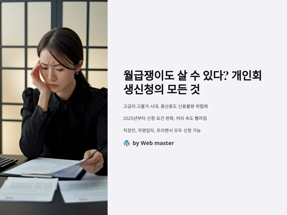 고금리·고물가 시대, 가계부는 점점 얇아지고 빚은 늘어만 갑니다. 이제는 중산층도 신용불량의 위험에 놓이며 '개인회생신청'이 특정 계층만의 이야기가 아니게 되었습니다. 2025년부터 적용되는 새로운 법률 개정안에 따라 신청 요건이 완화되고 처리 속도도 빨라지면서 개인회생은 현실적인 재기의 도구로 주목받고 있습니다.