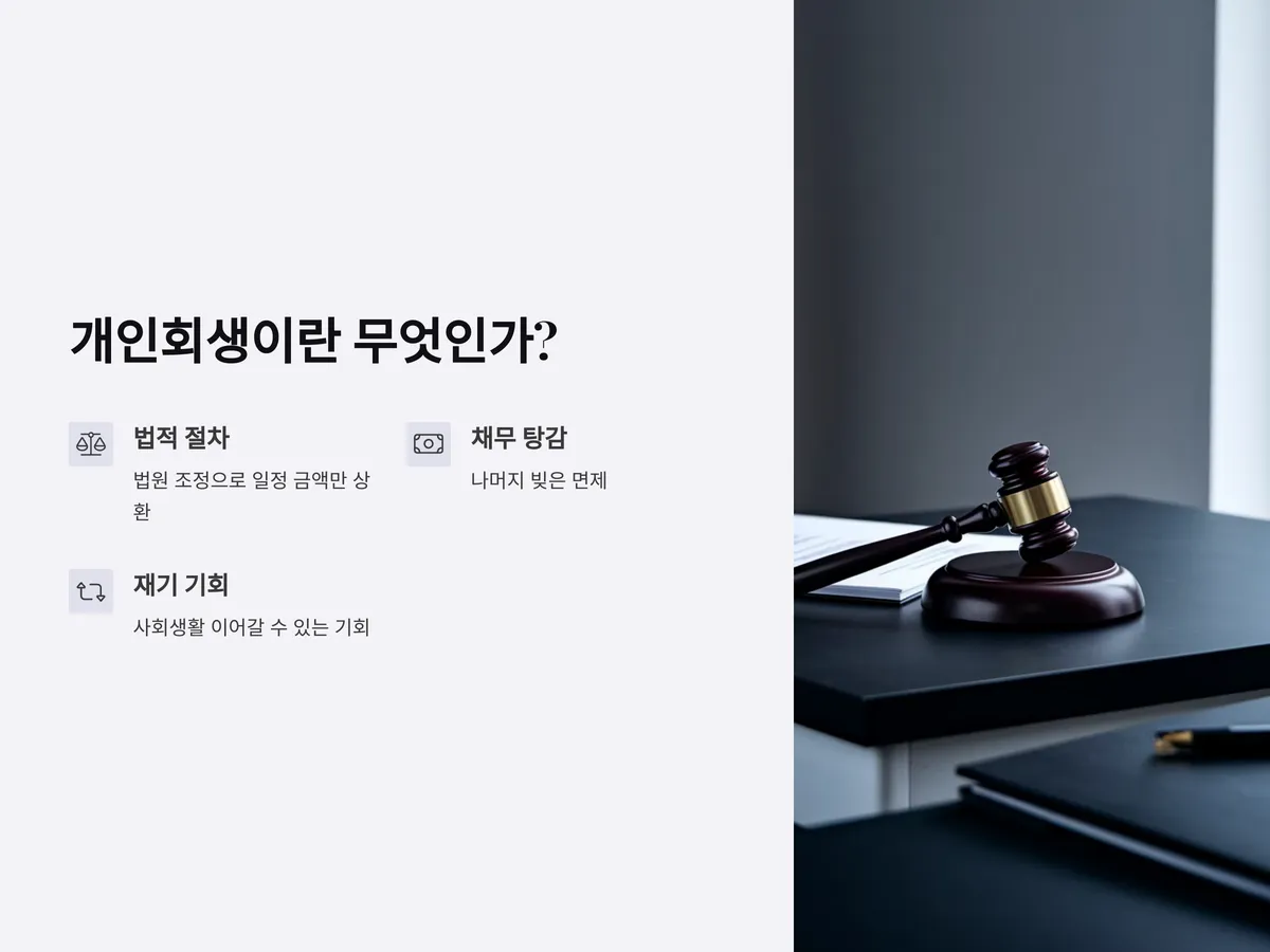 개인회생은 채무를 감당할 수 없는 상황에 처한 개인이 법원의 조정을 통해 일정 금액을 상환하고 나머지 채무를 탕감받는 법적 절차입니다. 쉽게 말하면, 파산보다는 덜 극단적이면서도 채무를 줄일 수 있는 제도입니다. 특히 채무 전액을 갚을 수 없는 상황에서도 일정 부분만 상환하면 남은 빚은 탕감되므로, 다시 사회생활을 이어가고자 하는 사람에게 매우 유용합니다.