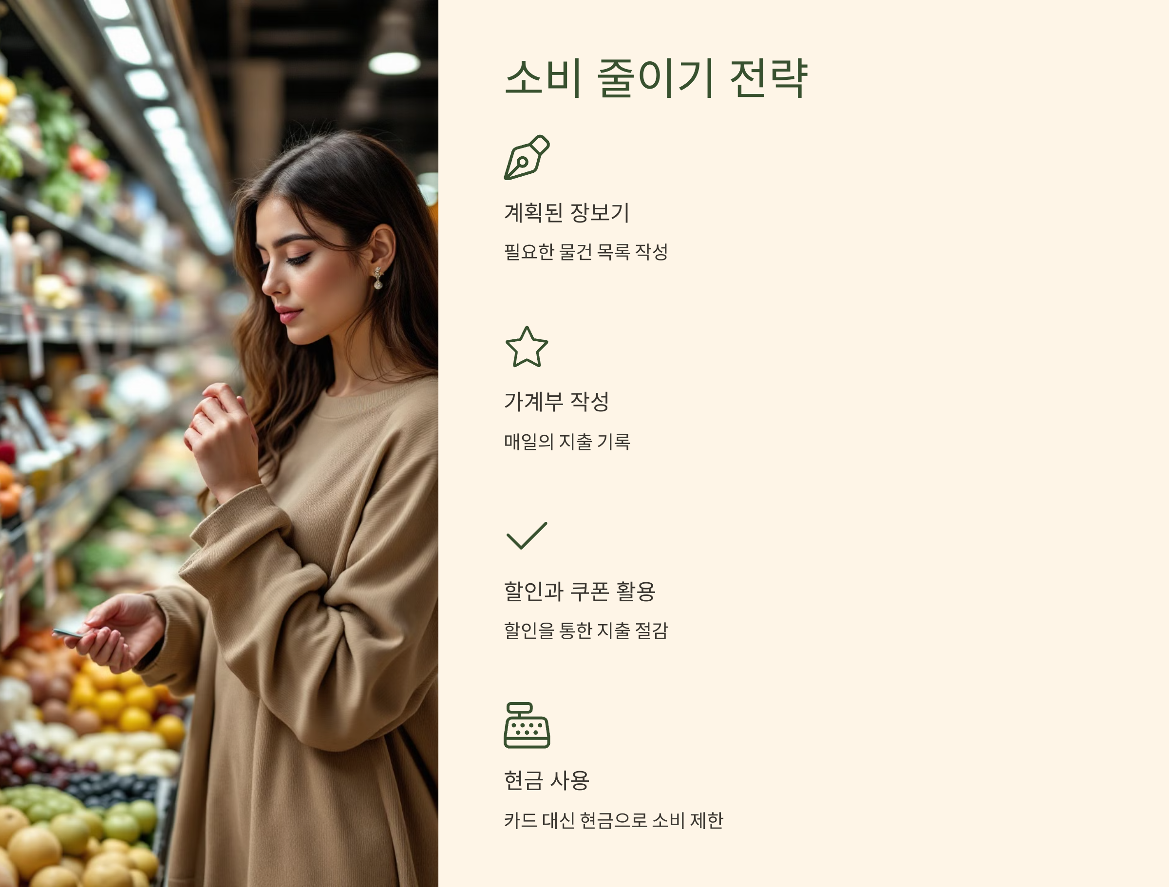 - 미리 계획한 장보기: 필요한 물건 목록을 작성하고 계획된 항목만 구입하여 불필요한 소비를 줄입니다.