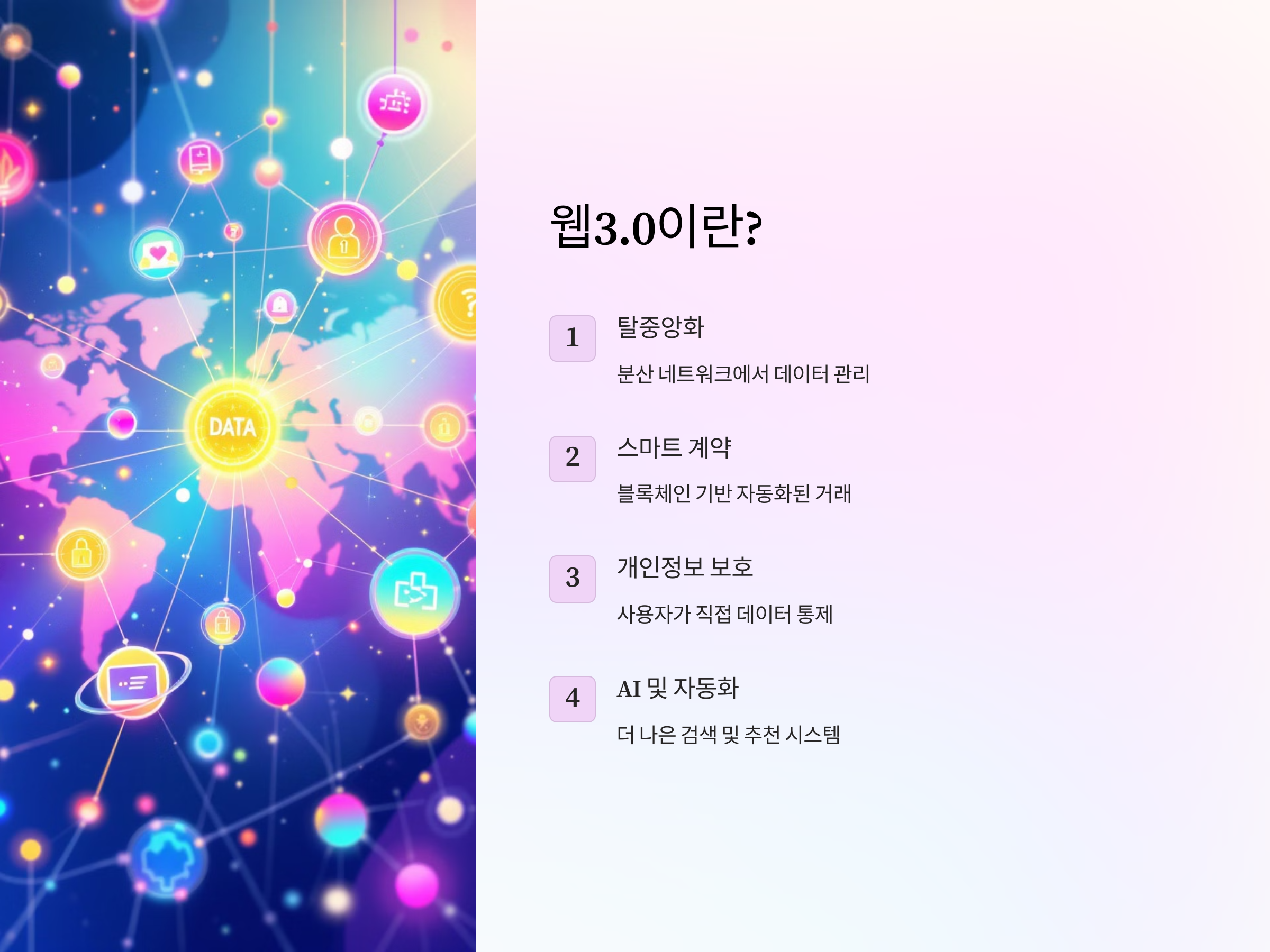 - AI 및 자동화(AI & Automation): 웹3.0에서는 인공지능과 자동화 기술이 활용되어 더 나은 검색 및 추천 시스템을 제공합니다.