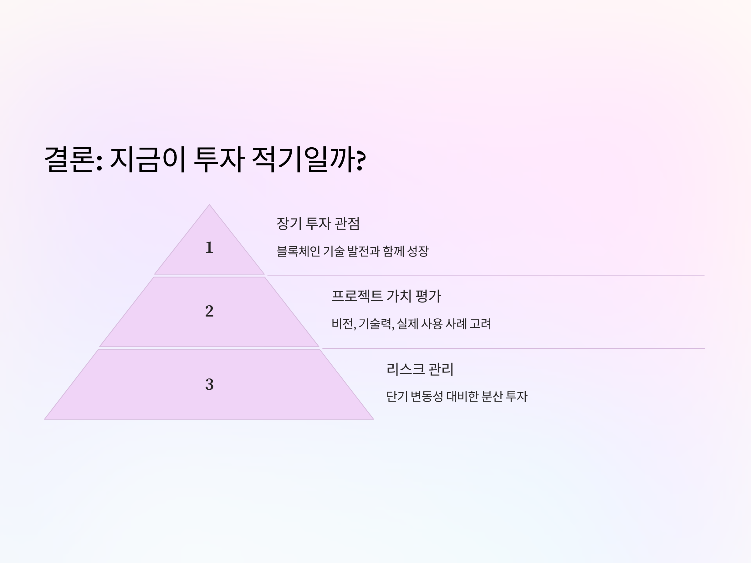 - 프로젝트 신뢰성 확인: 팀 구성, 백서(Whitepaper), 로드맵 등을 꼼꼼히 살펴보고 장기적인 생존 가능성을 판단해야 합니다.