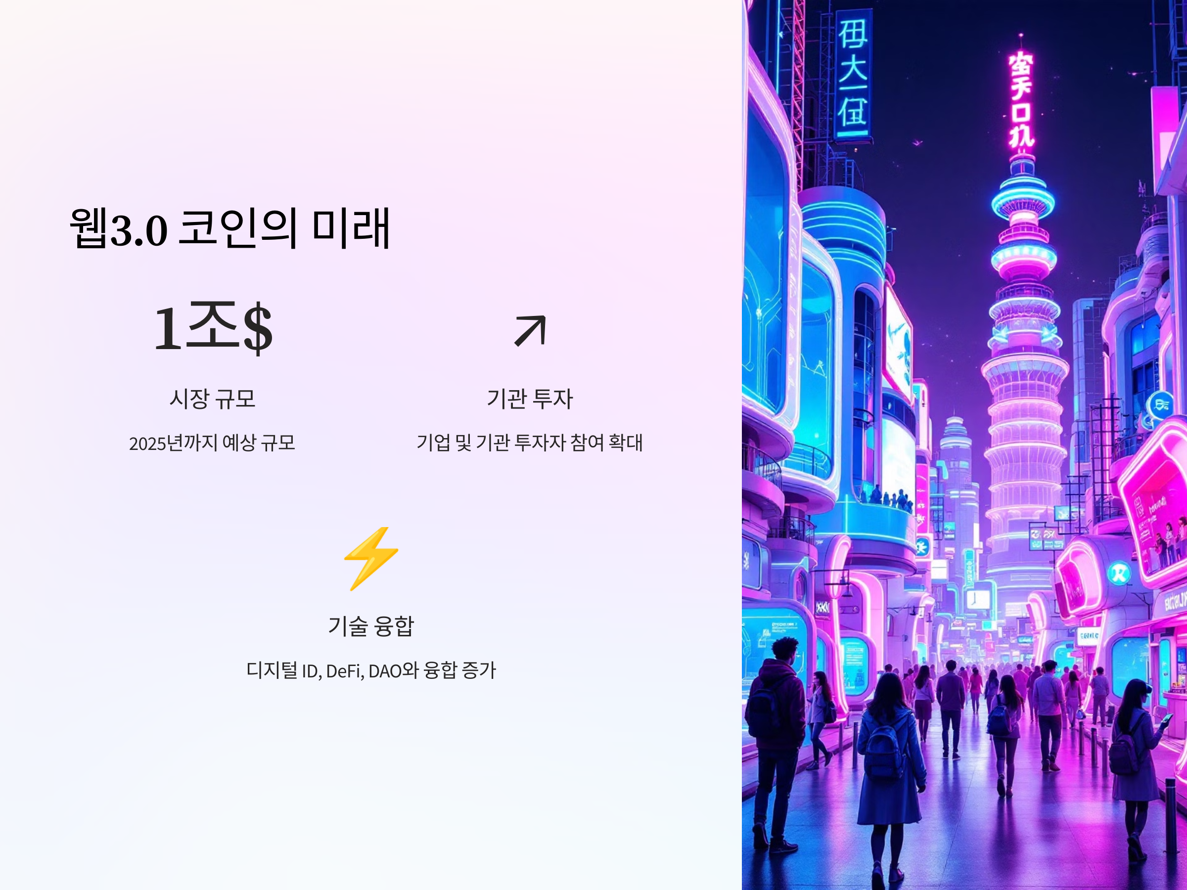 - 디지털 ID, 분산형 금융(DeFi), DAO(탈중앙화 자율 조직) 등과의 융합 증가