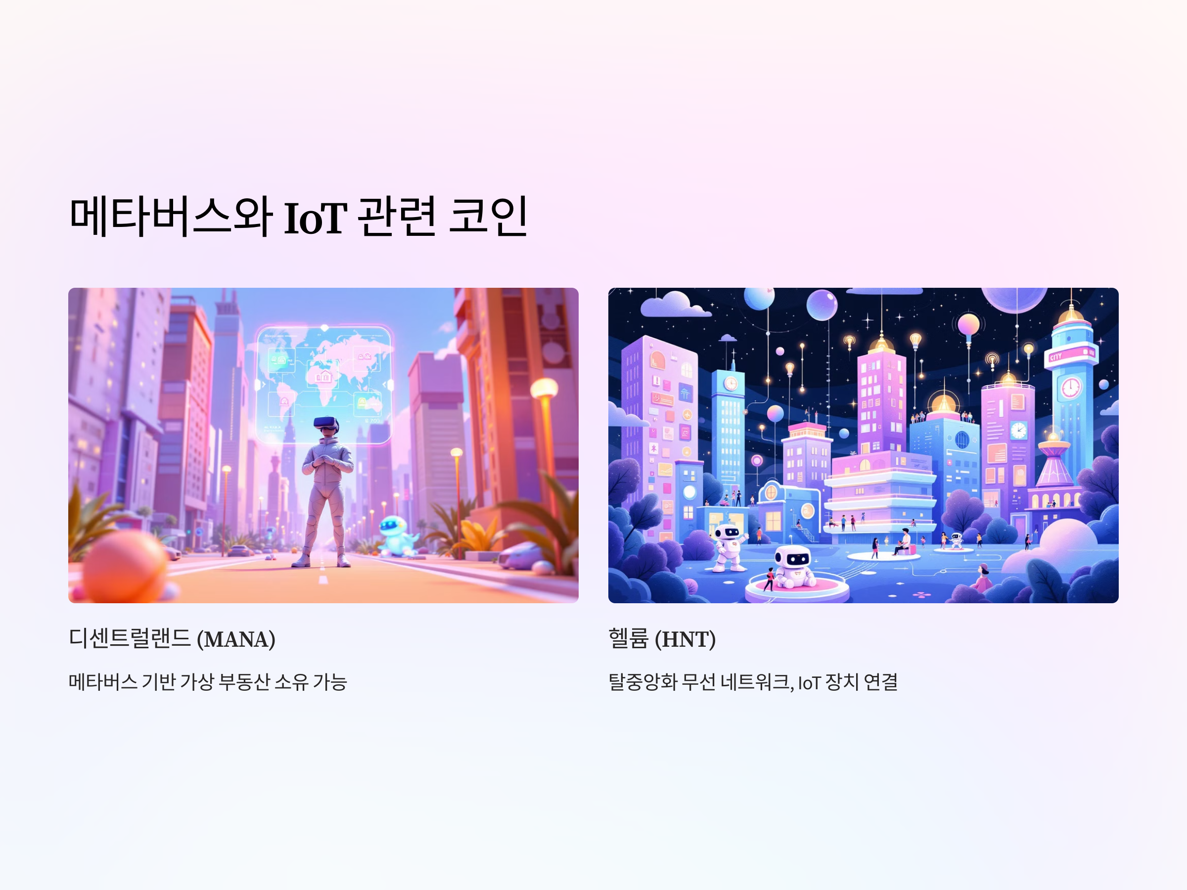 탈중앙화된 무선 네트워크 프로젝트로, IoT(사물인터넷) 장치들이 블록체인 기반 네트워크에서 안전하게 연결될 수 있도록 합니다. 5G 확산과 함께 성장 가능성이 높습니다.