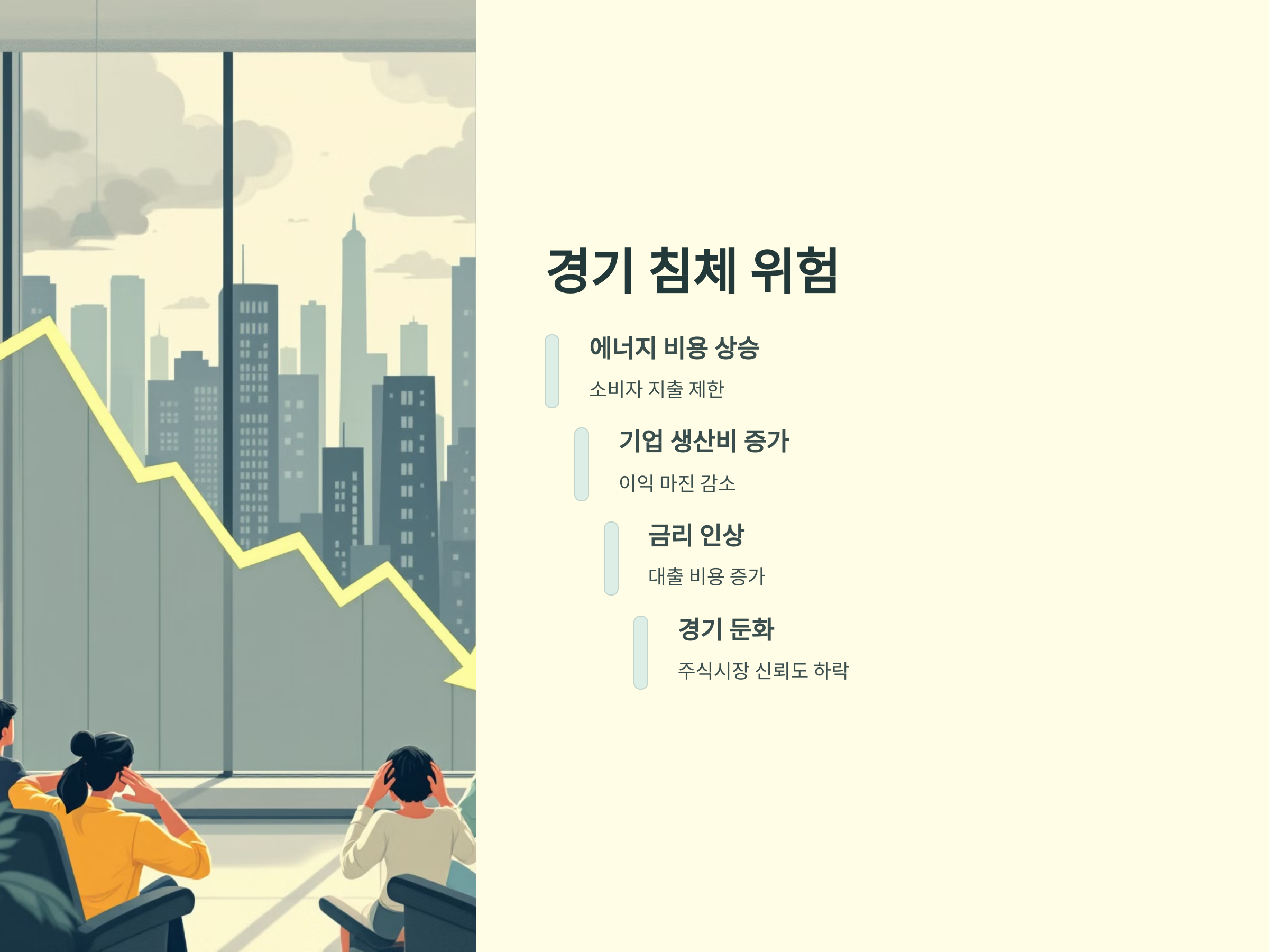 유가 상승이 지속되면, 경기 침체로 이어질 가능성도 있습니다. 에너지 가격 상승은 소비자들의 지출을 제한하고, 기업들의 생산비용을 증가시킬 수 있기 때문에 경기 성장에 부담을 줄 수 있습니다. 또한, 유가 상승은 금리 인상을 부추길 수 있으며, 이는 기업들의 대출 비용을 높이고 소비자들의 신용을 축소시킬 수 있습니다. 이로 인해 경기가 둔화되면 주식시장에 대한 투자자들의 신뢰도 낮아질 수 있습니다.