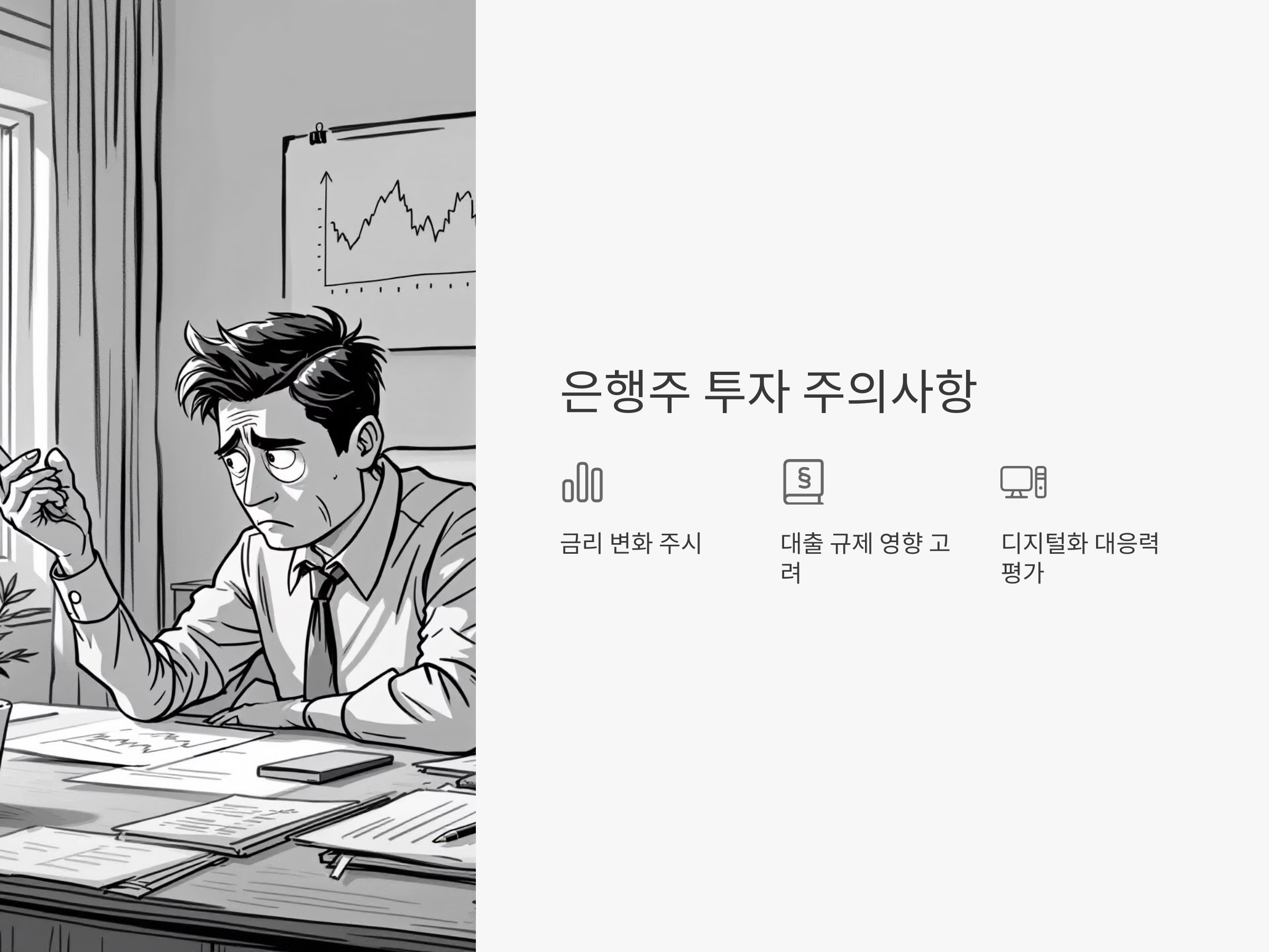 은행주에 투자할 때 가장 중요한 것은 금리 변화와 대출 규제입니다. 금리가 높아지면 은행의 수익성이 좋아지지만, 대출 수요가 줄어들 수 있습니다. 또한, 정부의 대출 규제 강화도 은행주의 수익성에 큰 영향을 미칩니다. 이 외에도 디지털화와 핀테크의 경쟁을 고려해야 합니다.