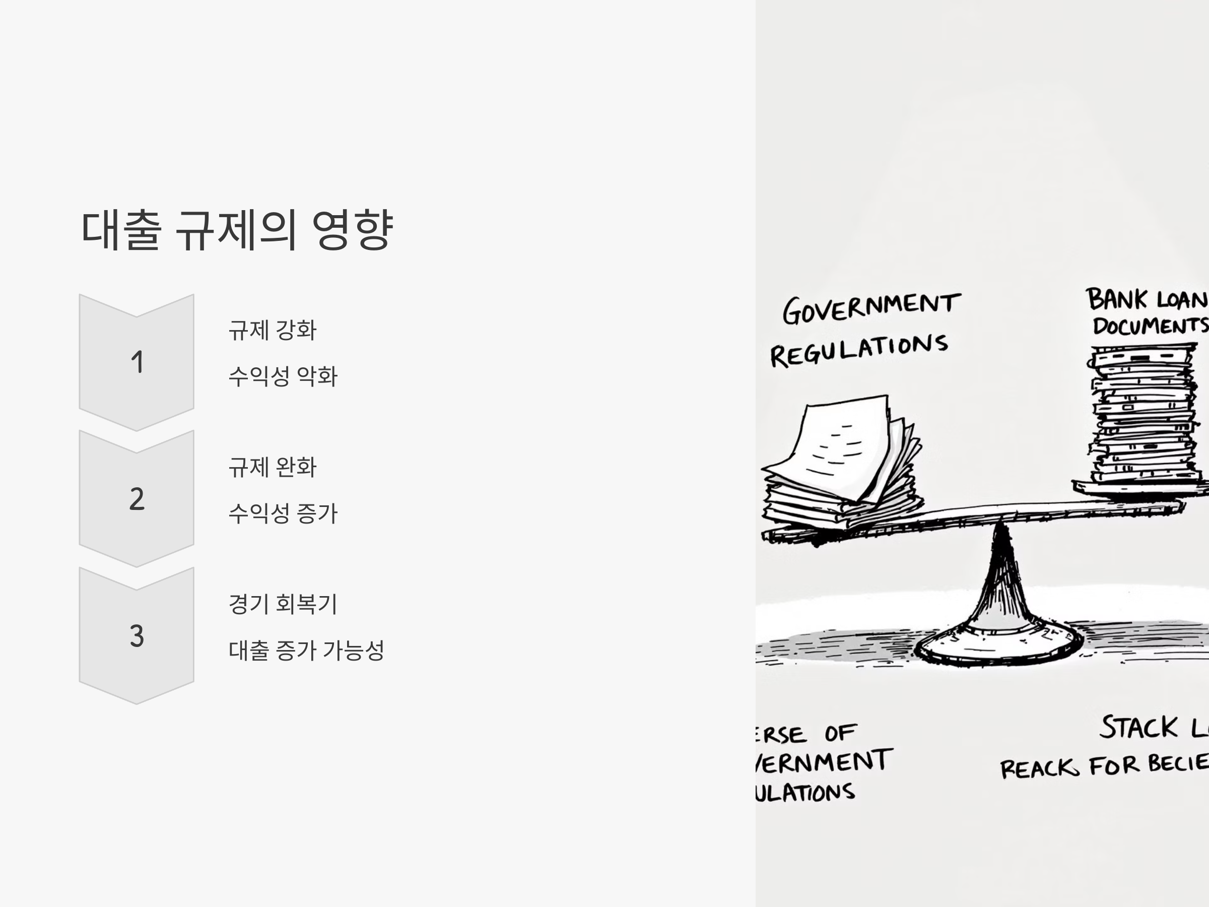 대출 규제가 강화되면 은행들은 더 많은 신용 평가와 담보 등을 요구하게 되어 대출 수요가 더욱 감소할 수 있습니다. 예를 들어, 정부가 대출 한도를 제한하거나, 높은 신용등급을 가진 사람만 대출을 받을 수 있도록 한다면, 은행의 대출 규모가 줄어들어 수익성이 감소할 가능성이 큽니다.