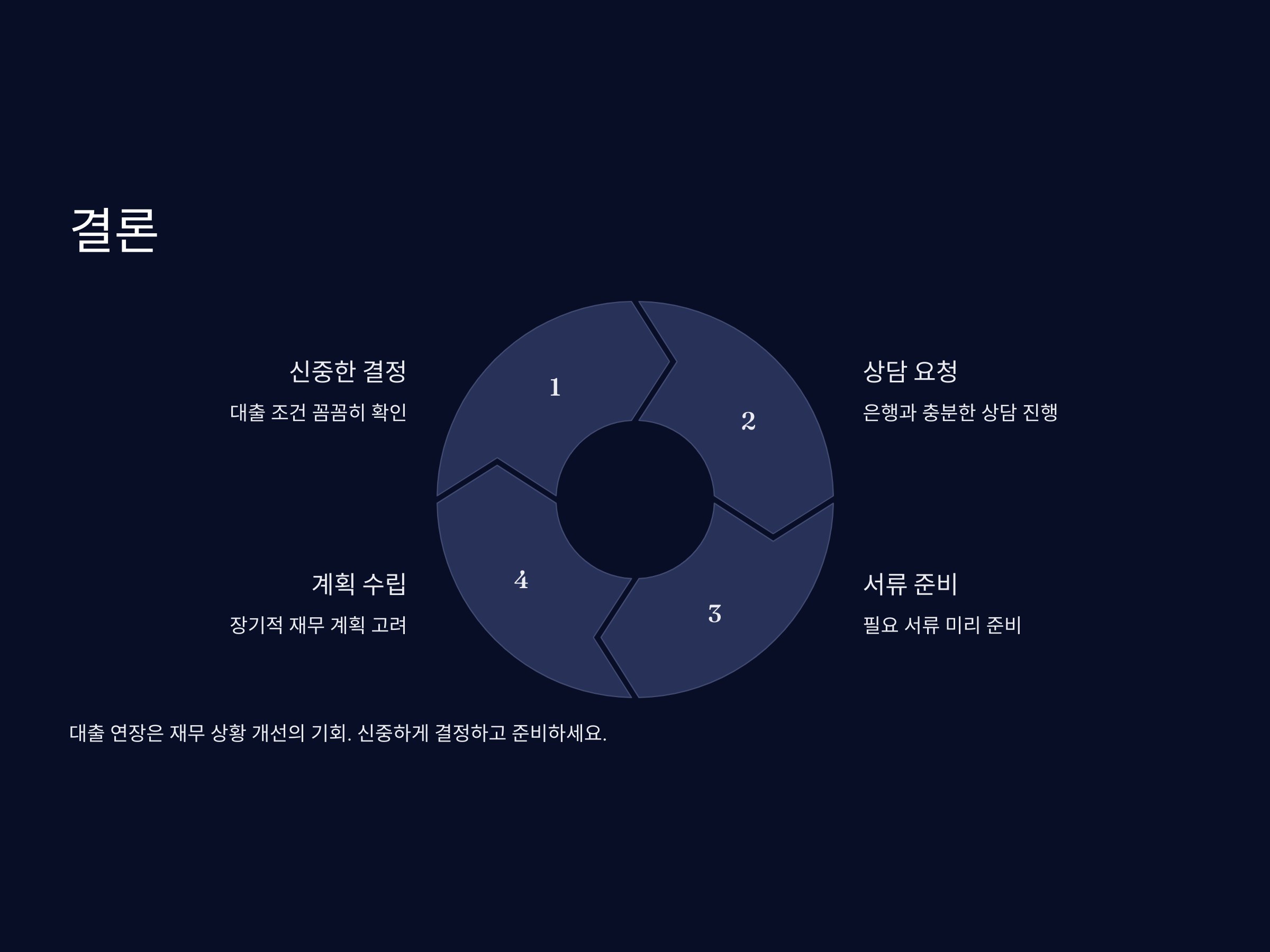 대출 연장은 단순한 상환 기간의 연장이 아니라, 새로운 금융 계획을 세우는 중요한 기회입니다. 대출 조건을 재조정하여 더 나은 조건으로 대출을 연장할 수 있으므로, 신중하게 진행하시기 바랍니다. 만약 대출 연장을 고려 중이라면, 먼저 은행과 상담하여 상황에 맞는 최적의 대출 연장 방법을 찾는 것이 중요합니다.