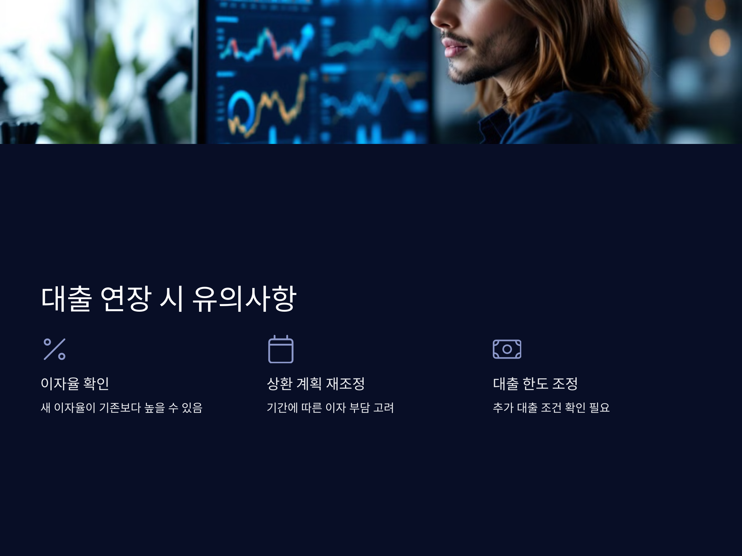 대출을 연장하는 과정에서 이자율이 조정될 수 있습니다. 은행에서 제시하는 새로운 이자율이 기존보다 높다면, 장기적으로 더 많은 금액을 상환해야 할 수 있습니다. 이자율을 충분히 확인하고 연장 여부를 결정해야 합니다.