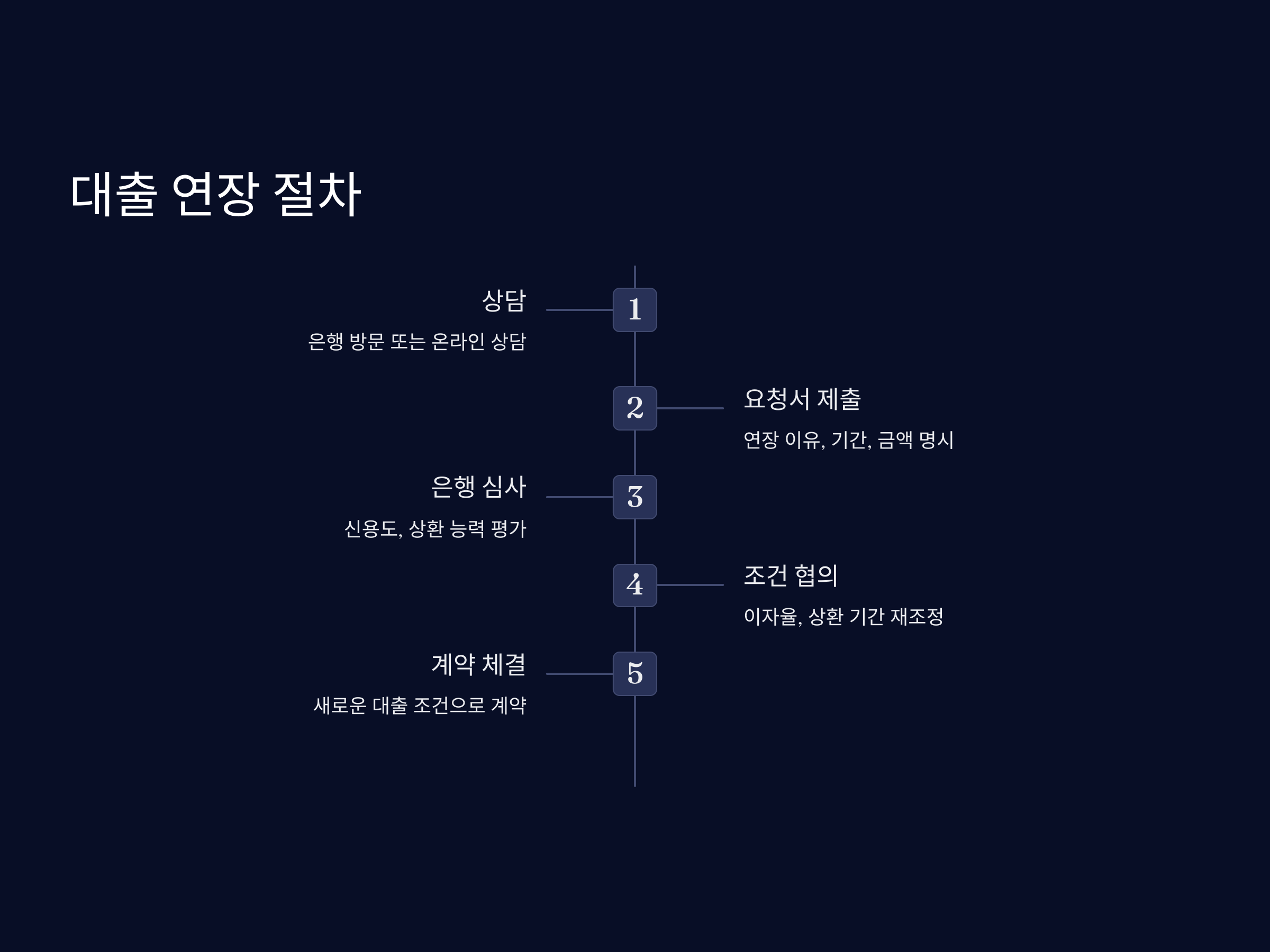 대출 연장은 은행과의 협의가 필요하며, 이를 통해 대출 조건을 변경할 수 있습니다. 대출 연장 절차는 아래와 같습니다.