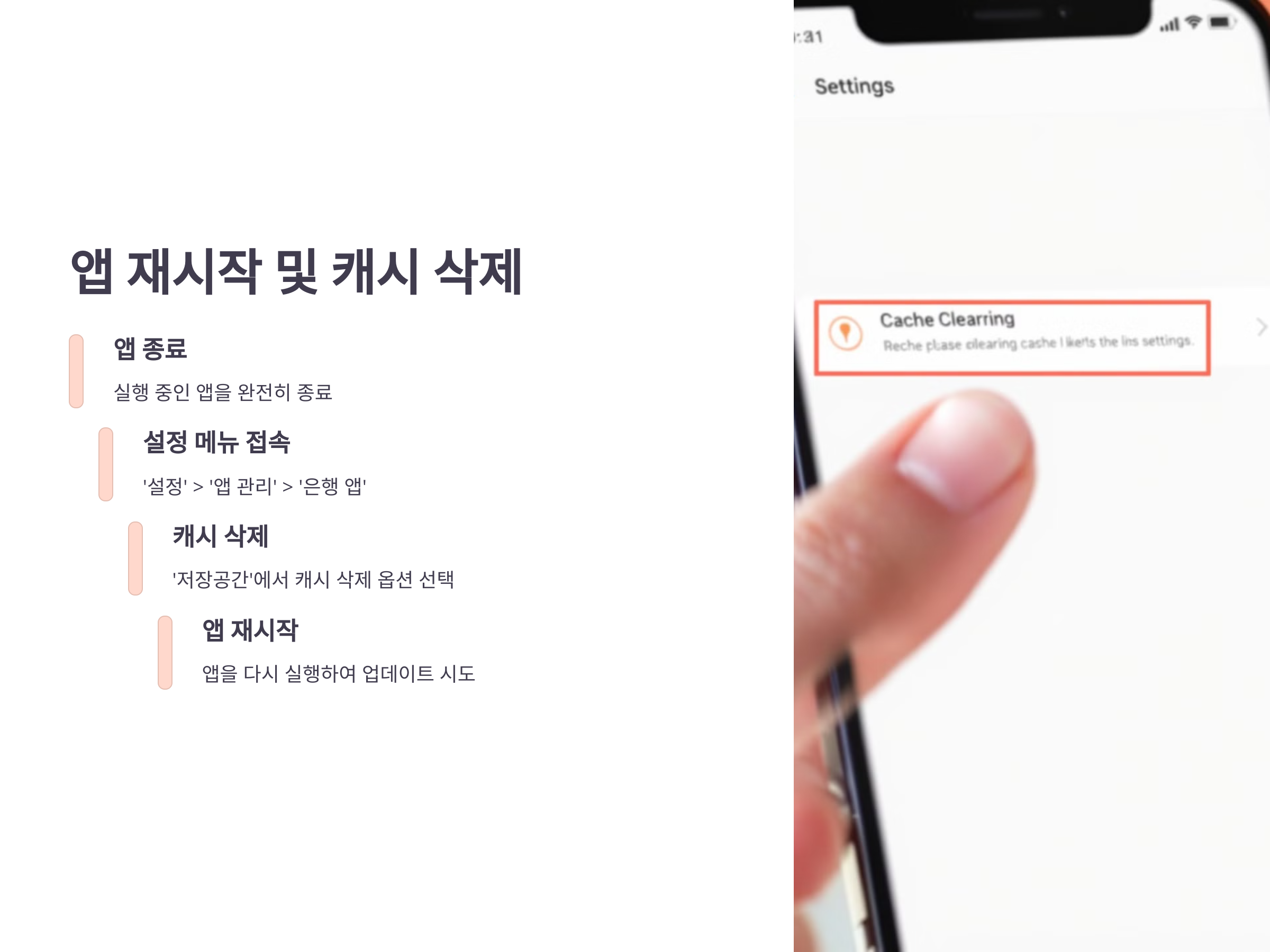 앱이 업데이트 중 오류를 발생시키면 가장 간단한 해결책은 앱을 종료하고 다시 시작하는 것입니다. 또한, 앱 캐시를 삭제하는 방법도 종종 효과적입니다. 스마트폰에서 '설정' > '앱 관리' > '은행 앱' > '저장공간'에서 캐시를 삭제하면 문제를 해결할 수 있는 경우가 많습니다.