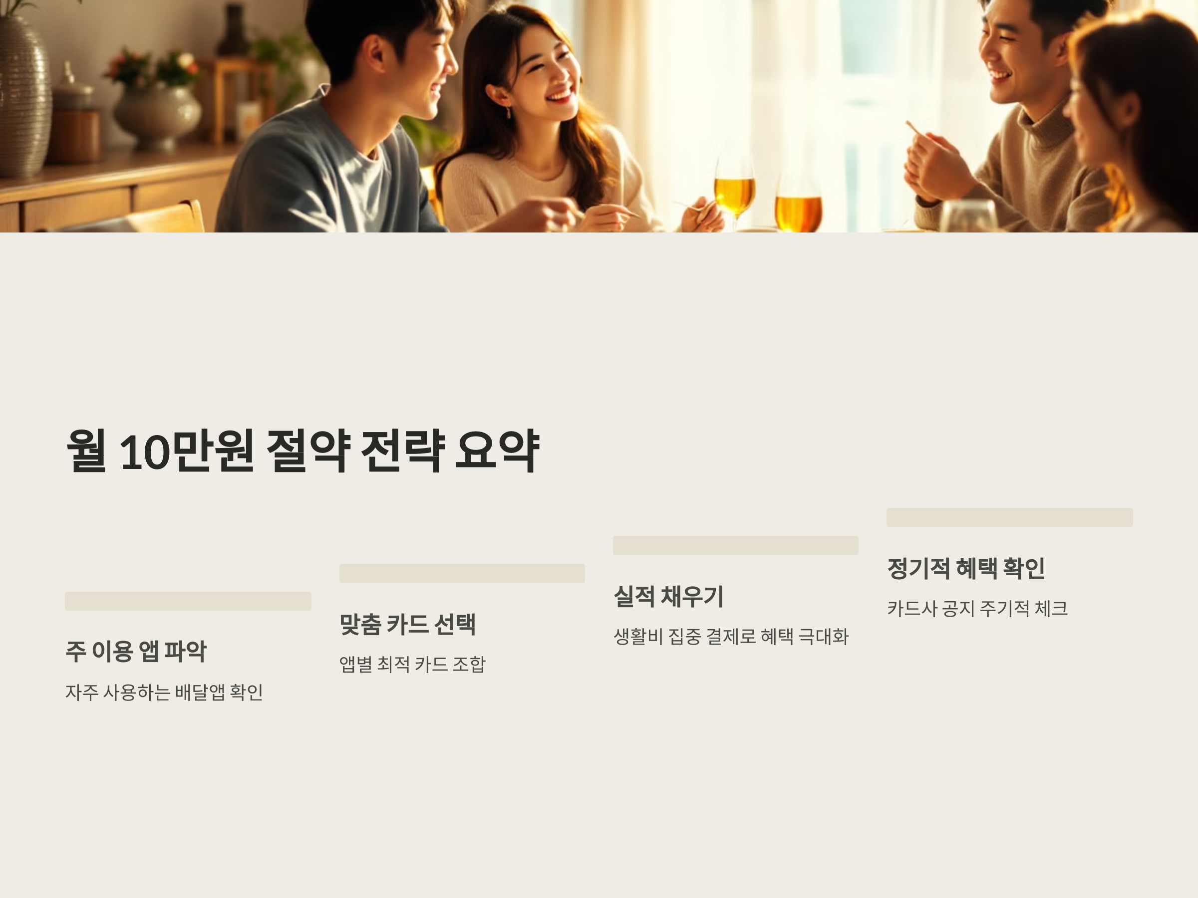 배달앱별로 추천하는 카드가 다르다는 사실, 알고 계셨나요? 배달의민족을 주로 이용한다면 KB국민 탄탄대로 올쇼핑 티타늄 카드를 추천합니다. 쿠팡이츠 이용자라면 현대카드 ZERO Edition2가 적합하며, 요기요는 롯데 LIKIT FUN 카드가 유리합니다. 각 배달앱과 카드사의 제휴에 따라 추가 포인트 적립, 즉시 할인 등의 혜택이 달라지기 때문에 자신이 주로 이용하는 배달앱과 매칭되는 카드를 선택해야 더 큰 혜택을 누릴 수 있습니다.
