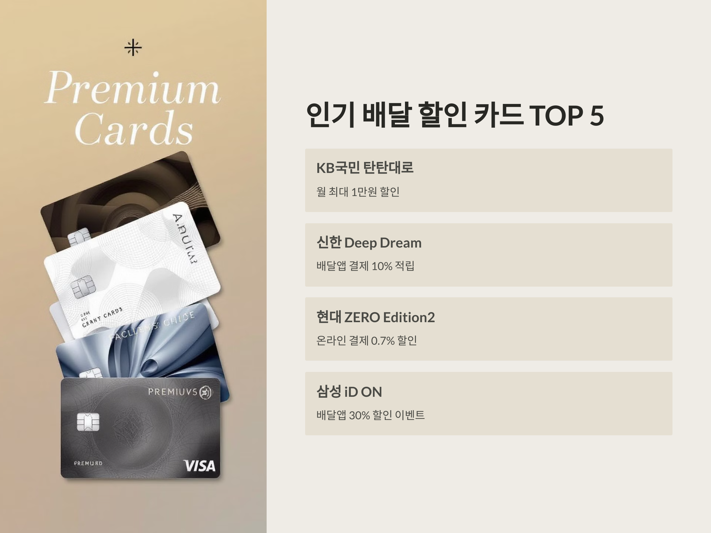 물가 상승과 외식비 부담이 커지면서 많은 분들이 배달 음식을 즐기되 비용 절감을 고민하게 되었습니다. 특히 2024년 들어 배달비 인상과 할인 쿠폰 축소 등으로 부담이 커진 상황에서, 음식 배달 할인 카드는 필수가 되고 있습니다. 최근에는 배달 앱 이용 시 최대 50%까지 할인받을 수 있는 혜택이 제공되는 카드들이 속속 등장하고 있으며, 월간 할인 한도도 높아져 알뜰하게 이용할 수 있습니다. 특히 배달의민족, 쿠팡이츠, 요기요 등 주요 배달 플랫폼과 연동된 카드별 혜택을 비교 분석해 자신에게 맞는 카드를 선택하는 것이 중요합니다. 더불어 2025년부터는 카드사별 배달 혜택 개편이 예고되어 있으니, 지금 카드 변경을 고려 중이라면 최신 정보를 꼭 확인해야 합니다. 지금부터 음식 배달 할인 카드의 모든 혜택과 꿀팁을 알아보겠습니다.