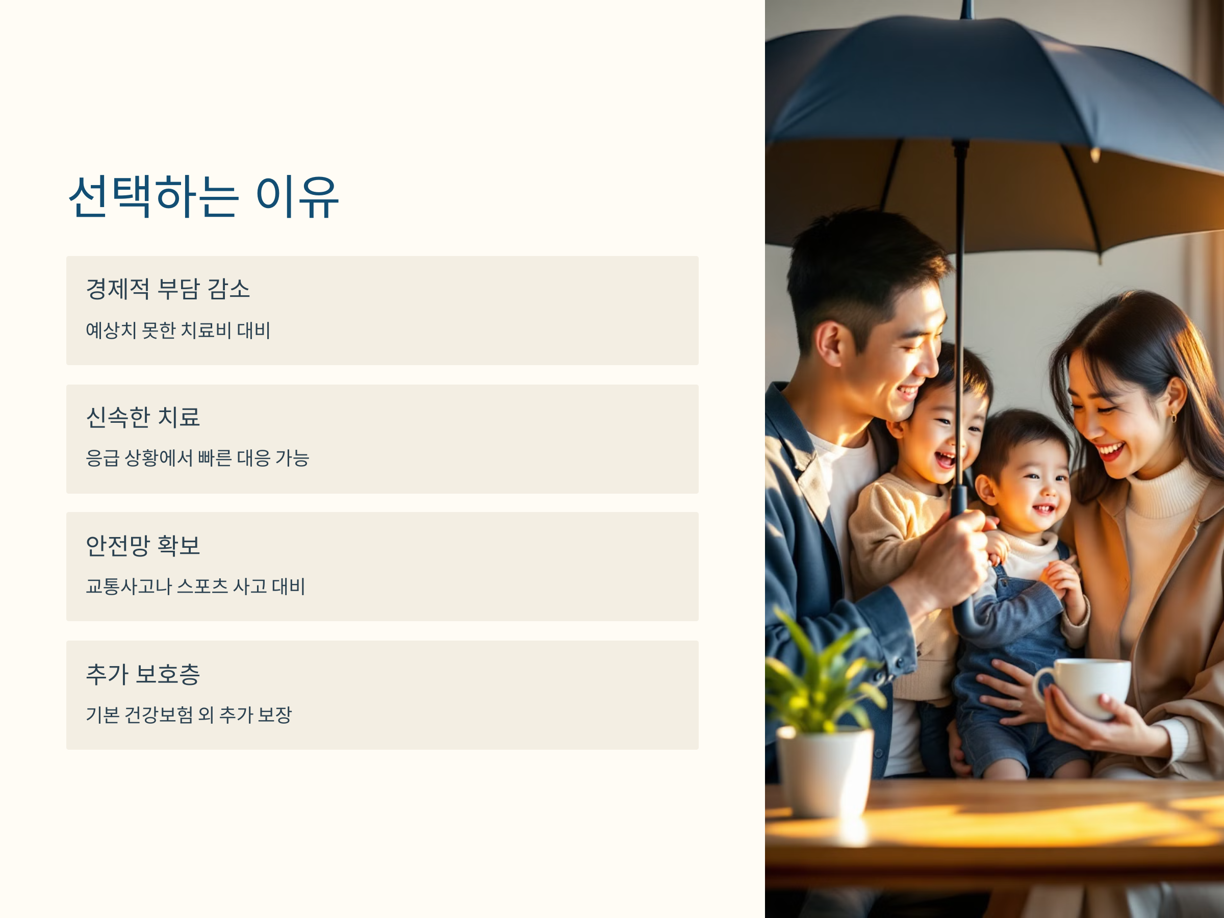응급 치료 보험 특약을 선택하는 이유는 급박한 상황에서의 경제적 부담을 덜어주기 위함입니다. 사고나 질병이 발생했을 때, 빠르게 치료를 받는 것이 가장 중요한데, 이때 드는 치료비를 미리 대비할 수 있습니다. 특히 교통사고나 스포츠 사고와 같은 예기치 못한 상황에서 응급 치료가 필요할 수 있으며, 이럴 때 보험 특약을 통해 상당한 혜택을 받을 수 있습니다.