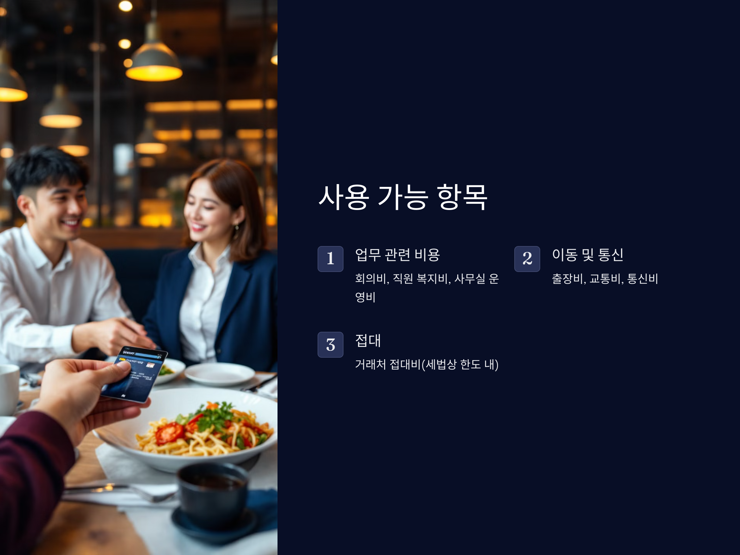 법인카드의 대표적인 사용 항목은 접대비, 복리후생비, 사무용품 구입비, 출장비 등이 있으며, 이 외에도 회사의 영업활동에 필요한 비용이라면 대부분 사용 가능합니다. 하지만 사적인 지출, 가족 식사비, 개인 여행 경비 등은 절대 금지됩니다.