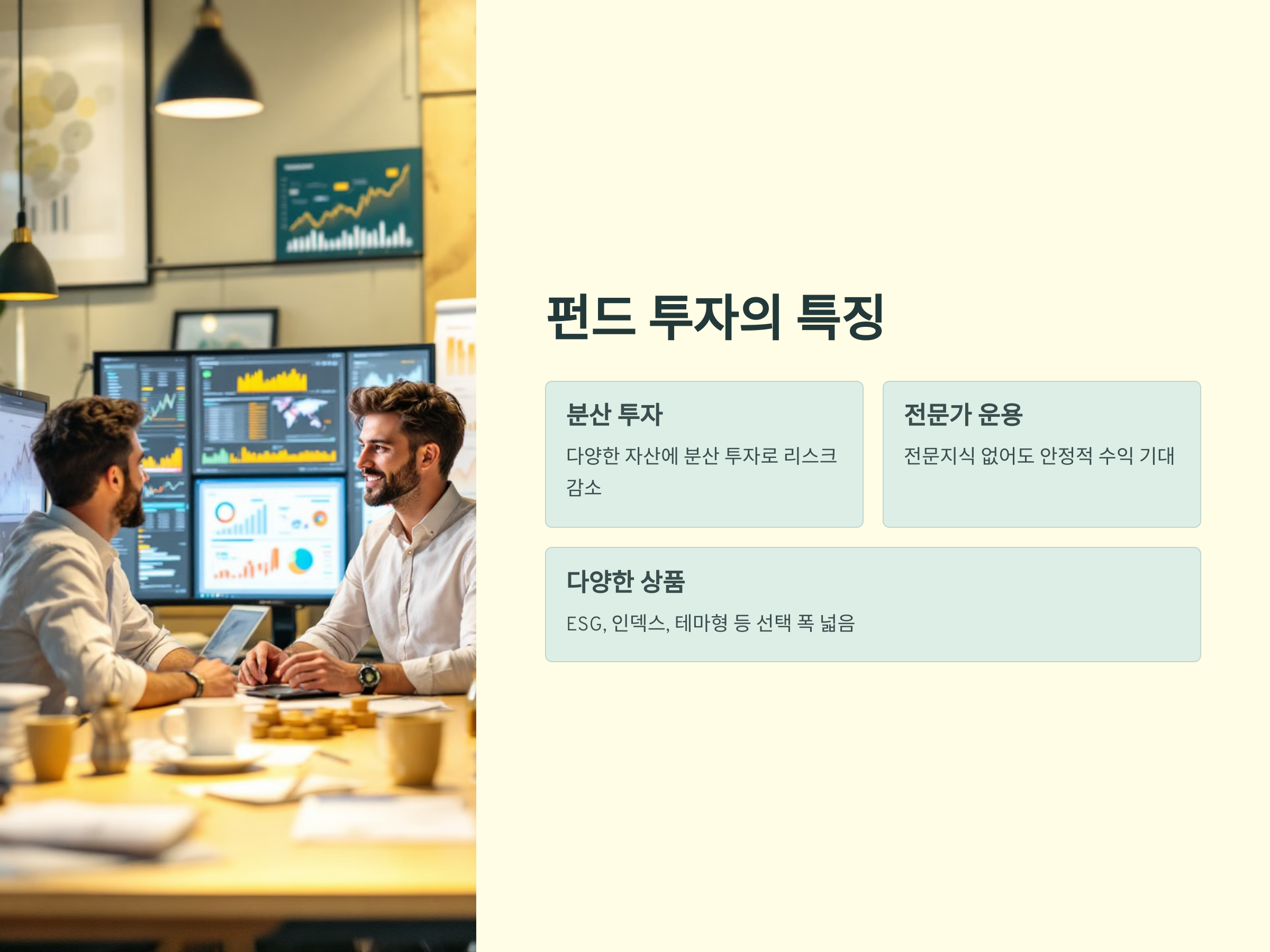 펀드는 다수의 투자자로부터 자금을 모아 전문가가 주식, 채권, 부동산 등 다양한 자산에 분산 투자하는 금융 상품입니다. 특히 초보자에게 적합한 이유는 전문가가 운용하기 때문에 투자에 대한 전문지식이 부족해도 안정적인 수익을 기대할 수 있기 때문입니다. 또한 분산 투자를 통해 리스크를 줄일 수 있어, 한 종목에 몰빵하는 위험을 방지합니다. 최근에는 ESG 펀드, 인덱스 펀드, 테마형 펀드 등 다양한 상품이 출시되며 투자자들의 선택 폭이 넓어졌습니다. 다만, 펀드는 수익률이 상대적으로 낮고, 운용 수수료가 발생하기 때문에 장기적인 관점에서 접근하는 것이 좋습니다.