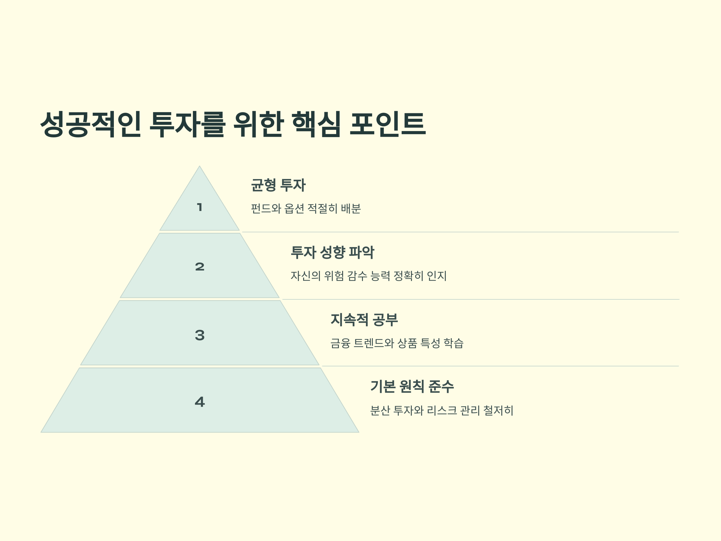 펀드는 투자 경험이 적거나 안정적인 수익을 원하는 사람에게 적합합니다. 특히 직장인처럼 매달 일정 금액을 적립식으로 투자해 장기적으로 운용하기 좋은 상품입니다. 반면 옵션은 시장에 대한 분석 능력이 뛰어나고, 고위험을 감수할 수 있는 투자자에게 적합합니다. 최근에는 펀드와 옵션을 혼합해 포트폴리오를 구성하는 경우도 많아졌습니다. 예를 들어, 펀드로 자산의 80%를 안전하게 운용하고, 옵션으로 20%를 활용해 추가 수익을 노리는 방식입니다. 이처럼 각 상품의 장단점을 이해하고 균형 잡힌 투자가 중요합니다.