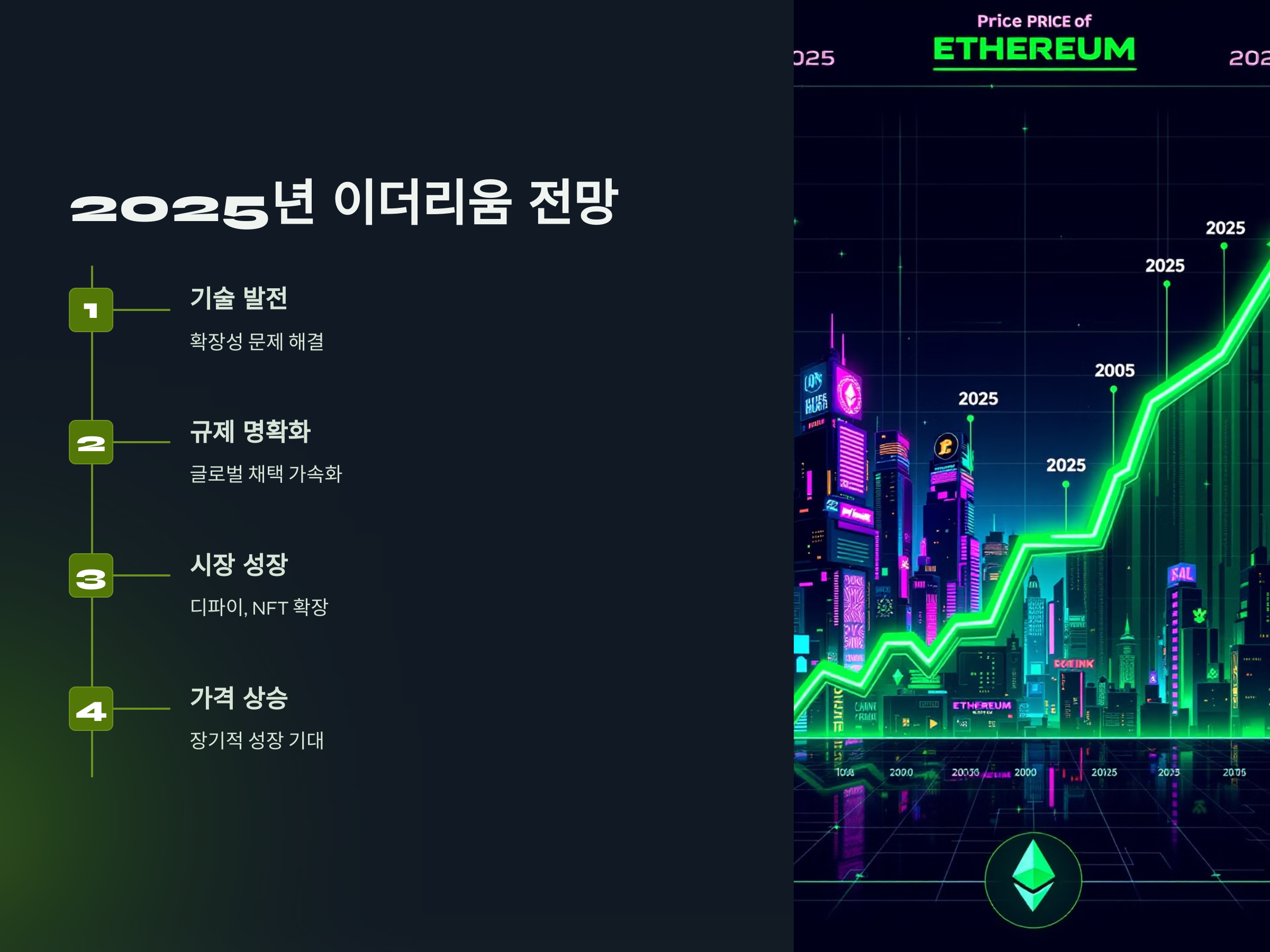 이더리움은 이 두 분야에서 핵심적인 역할을 하고 있으며, 앞으로도 이러한 시장의 성장이 이더리움 가격에 긍정적인 영향을 미칠 것입니다. 2025년까지 디파이와 NFT 시장은 더욱 확장될 것으로 예상되며, 이로 인해 이더리움의 수요도 더욱 증가할 것입니다.