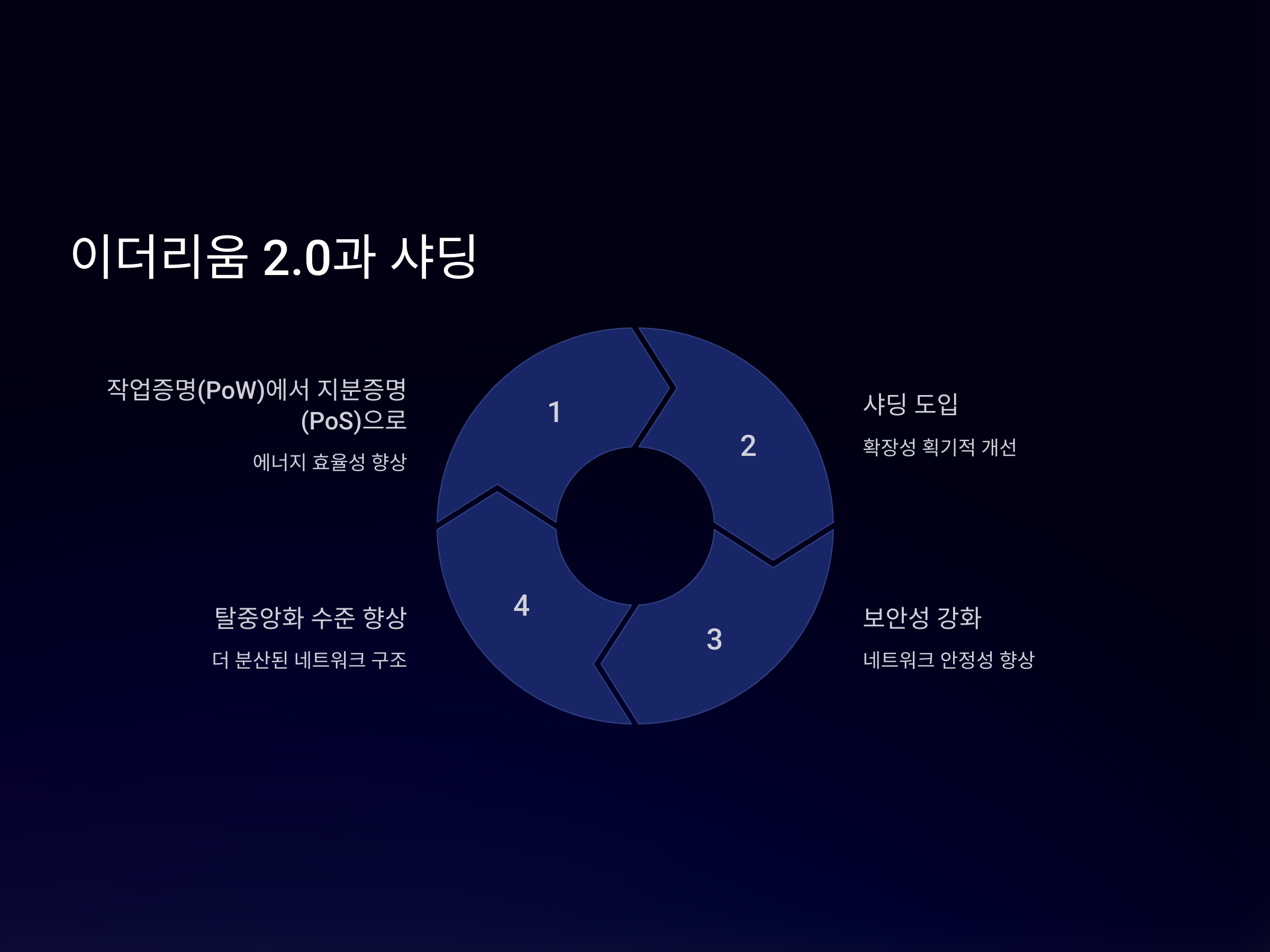 이더리움 샤딩은 이더리움 2.0의 핵심 기능 중 하나로, 이더리움의 업그레이드가 완료되면 본격적으로 샤딩이 적용될 예정입니다. 이더리움 2.0은 기존의 작업증명(PoW)에서 지분증명(PoS)으로 전환되는 큰 변화와 함께, 샤딩을 통해 확장성을 획기적으로 개선할 계획입니다. 이 업그레이드는 기존의 이더리움 네트워크의 처리 능력을 크게 향상시킬 뿐만 아니라, 보안성과 탈중앙화 수준도 높일 수 있는 중요한 기술적 혁신을 제공합니다.