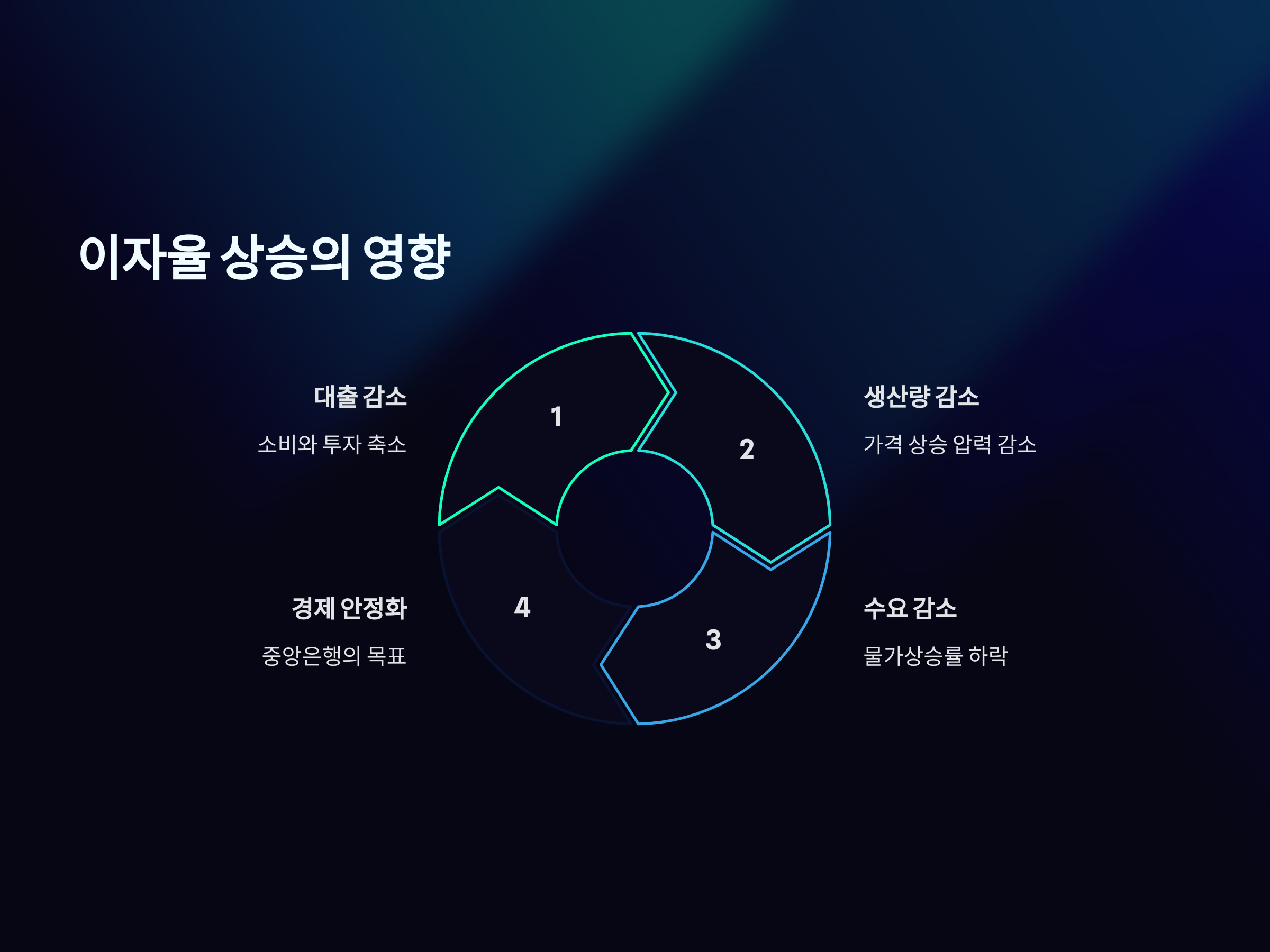 이자율이 상승하면 소비자와 기업은 대출을 덜 받게 되고, 이는 소비와 투자를 줄이는 결과를 가져옵니다. 기업들이 투자를 줄이면 생산량이 감소하고, 이로 인해 가격 상승 압력이 줄어들게 됩니다. 또한, 사람들이 돈을 적게 쓰면 상품과 서비스에 대한 수요가 줄어들어 물가 상승률이 낮아집니다. 이처럼 중앙은행은 이자율을 조정함으로써 물가를 안정시키려고 합니다.