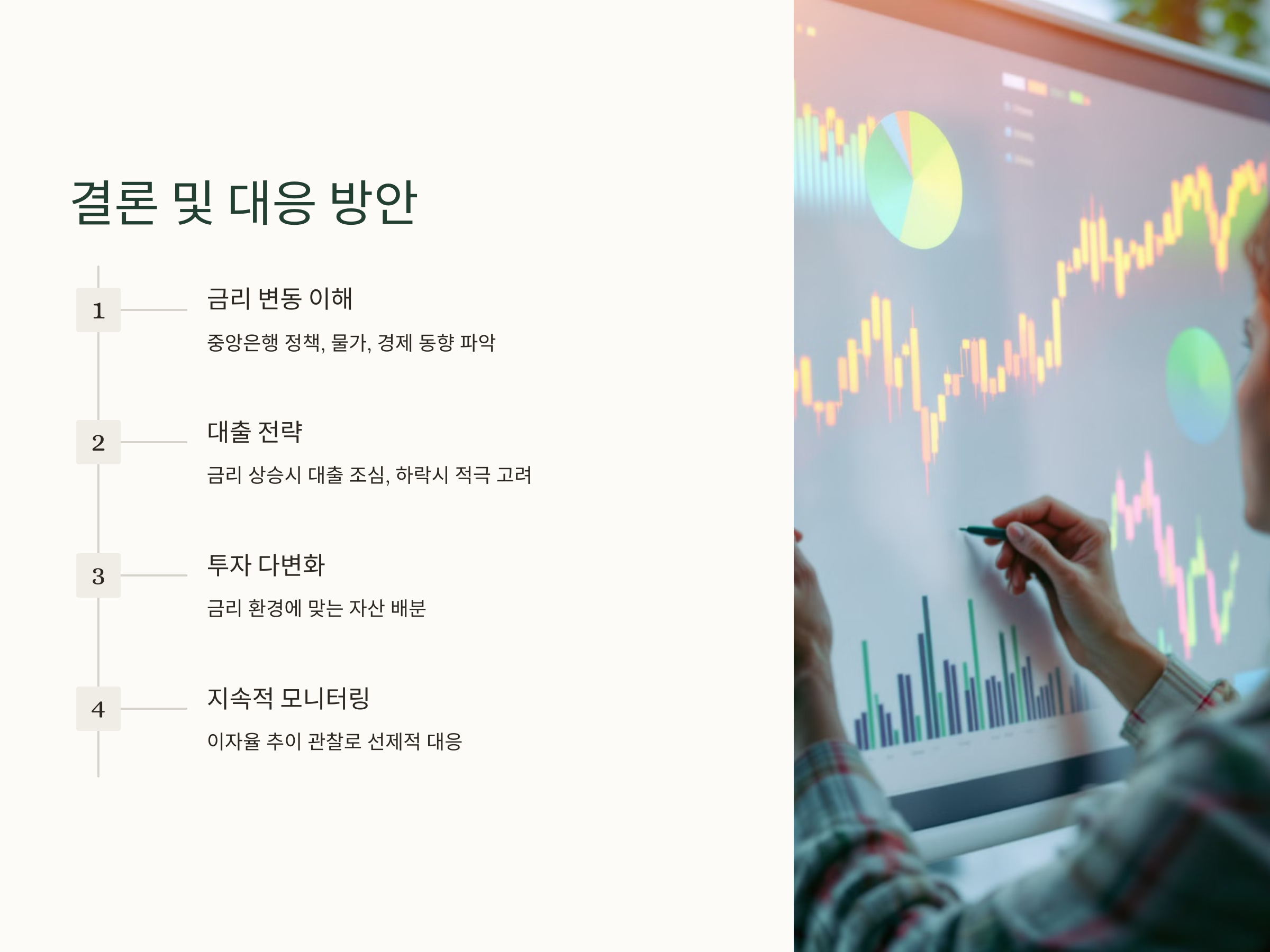 2025년 이자율 변동에 대비한 투자 및 대출 전략은 매우 중요합니다. 금리가 상승할 경우 대출이 부담스럽게 느껴질 수 있지만, 이는 반대로 예금금리 상승으로 이어질 수 있기 때문에 예금에 대한 관심도 커질 것입니다. 또한, 금리 상승에 대응하기 위해 채권이나 주식 등 다양한 자산에 분산 투자하는 전략을 취하는 것이 필요합니다.