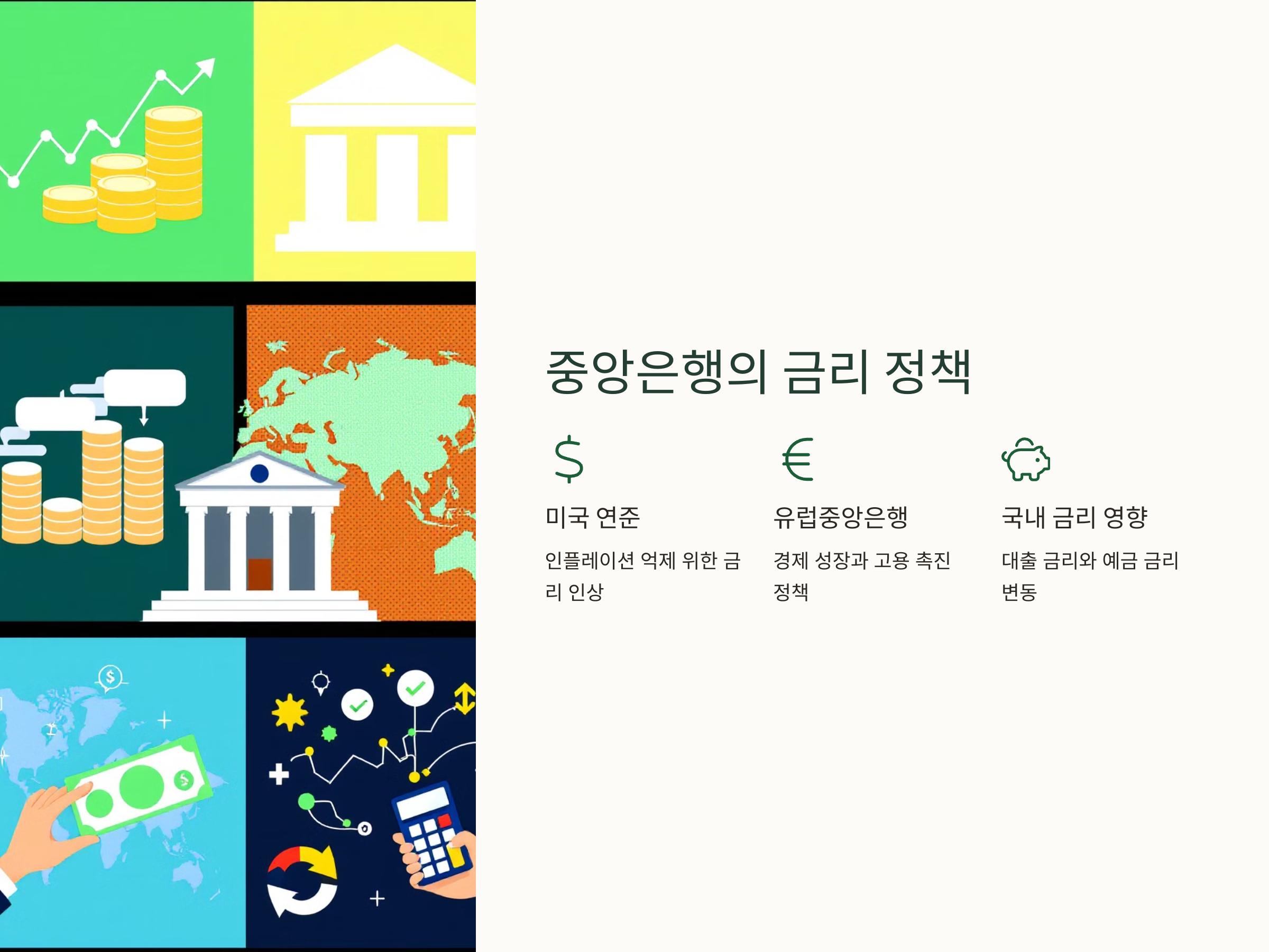 중앙은행은 금리를 조정하면서 경제를 안정시키기 위해 다양한 정책을 사용합니다. 예를 들어, 미국 연준은 금리 인상으로 인플레이션을 억제하려고 하고, 반대로 유럽중앙은행은 금리를 낮춰 경제 성장과 고용을 촉진하려는 정책을 펼칩니다. 이런 변화들은 각국의 경제에 큰 영향을 미칩니다.