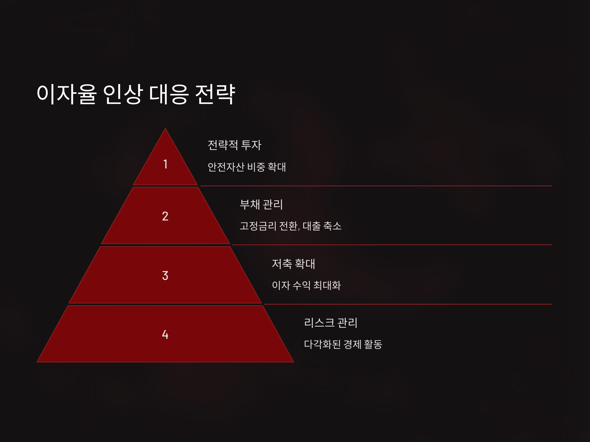 기업은 자금 조달 방식에 대한 재조정을 통해 이자 부담을 최소화할 수 있습니다. 예를 들어, 대출을 줄이고 자본을 강화하는 방식으로 위험을 분산시킬 수 있습니다. 또한, 경제 불확실성이 커질수록 리스크 관리가 중요해지므로, 기업은 리스크를 관리하기 위한 다양한 전략을 마련하는 것이 필요합니다.