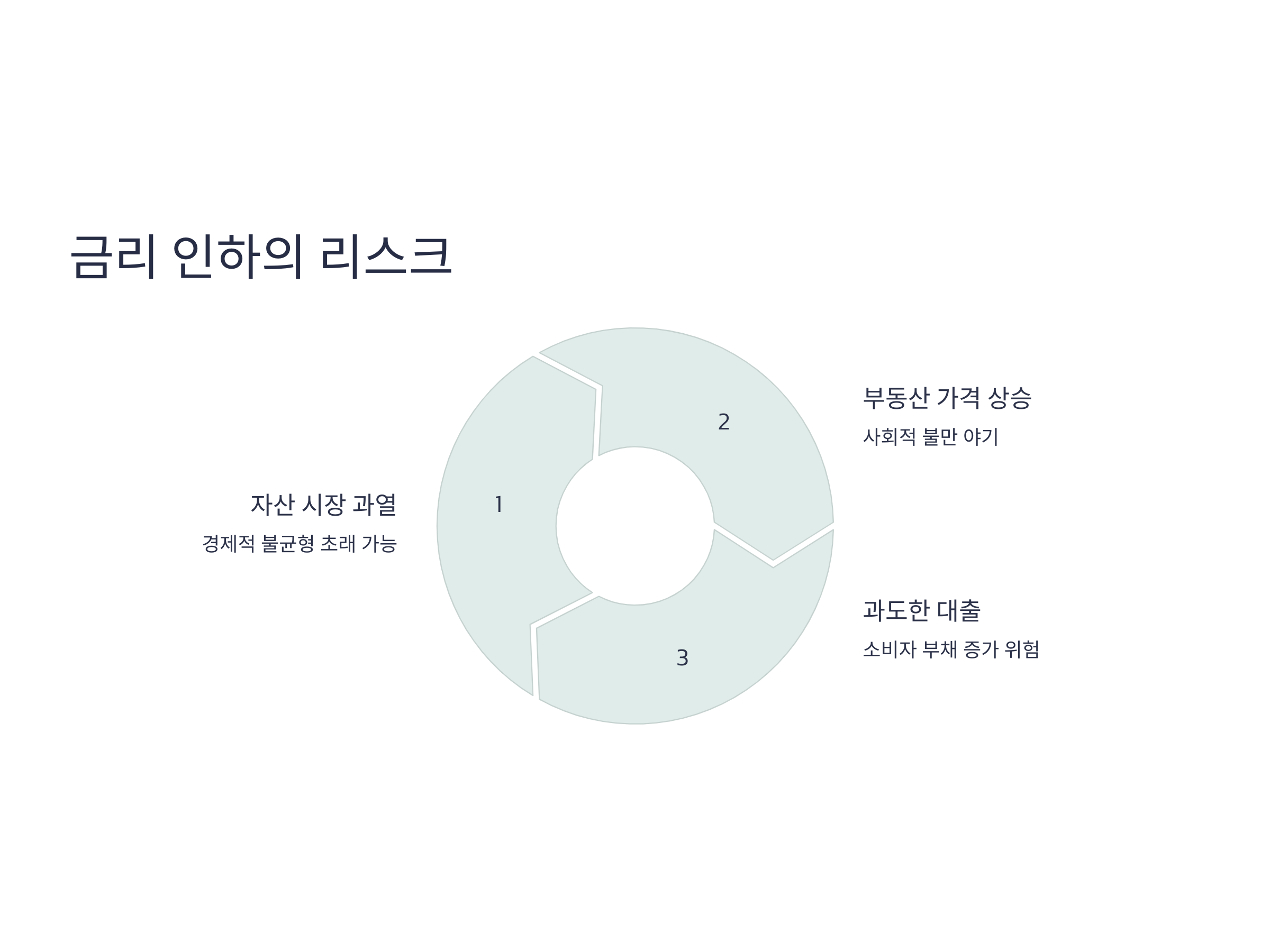 금리 인하에는 장점이 있지만, 동시에 리스크도 존재합니다. 지나친 금리 인하는 자산 시장의 과열을 유발할 수 있고, 이는 다시 경제적 불균형을 초래할 수 있습니다. 예를 들어, 부동산 시장의 과열은 가격 상승을 불러일으켜 사회적 불만을 초래할 수 있으며, 지나치게 낮은 금리가 소비자들을 과도한 대출로 몰아갈 위험도 있습니다【12†source】.